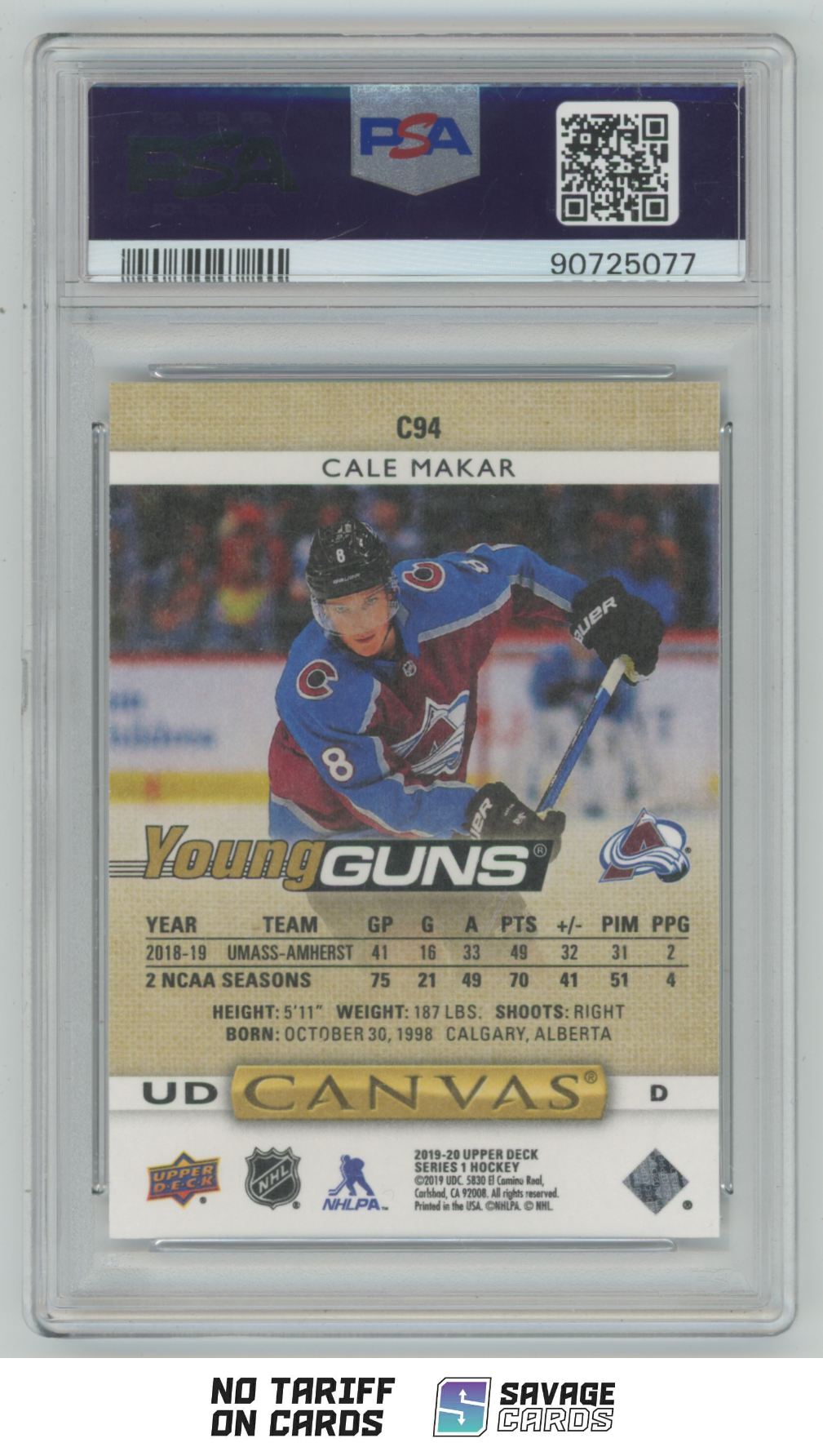 | 2019-20 Upper Deck UD Canvas Young Guns Cale Makar PSA 10 #C94 Colorado | ||||||||||||||||||
