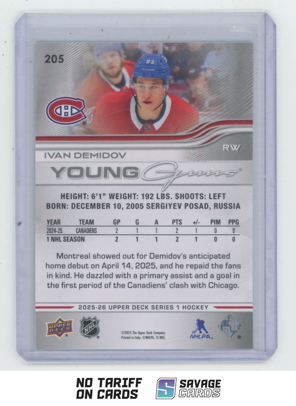 | 2025-26 Upper Deck Young Guns Ivan Demidov #205 Montreal Canadiens | ||||||||||||||||