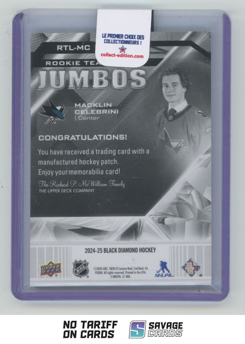 | 2024-25 UD Black Diamond Rookie Team Logo Jumbos Macklin Celebrini #RTL-MC San | ||||||||||||||||