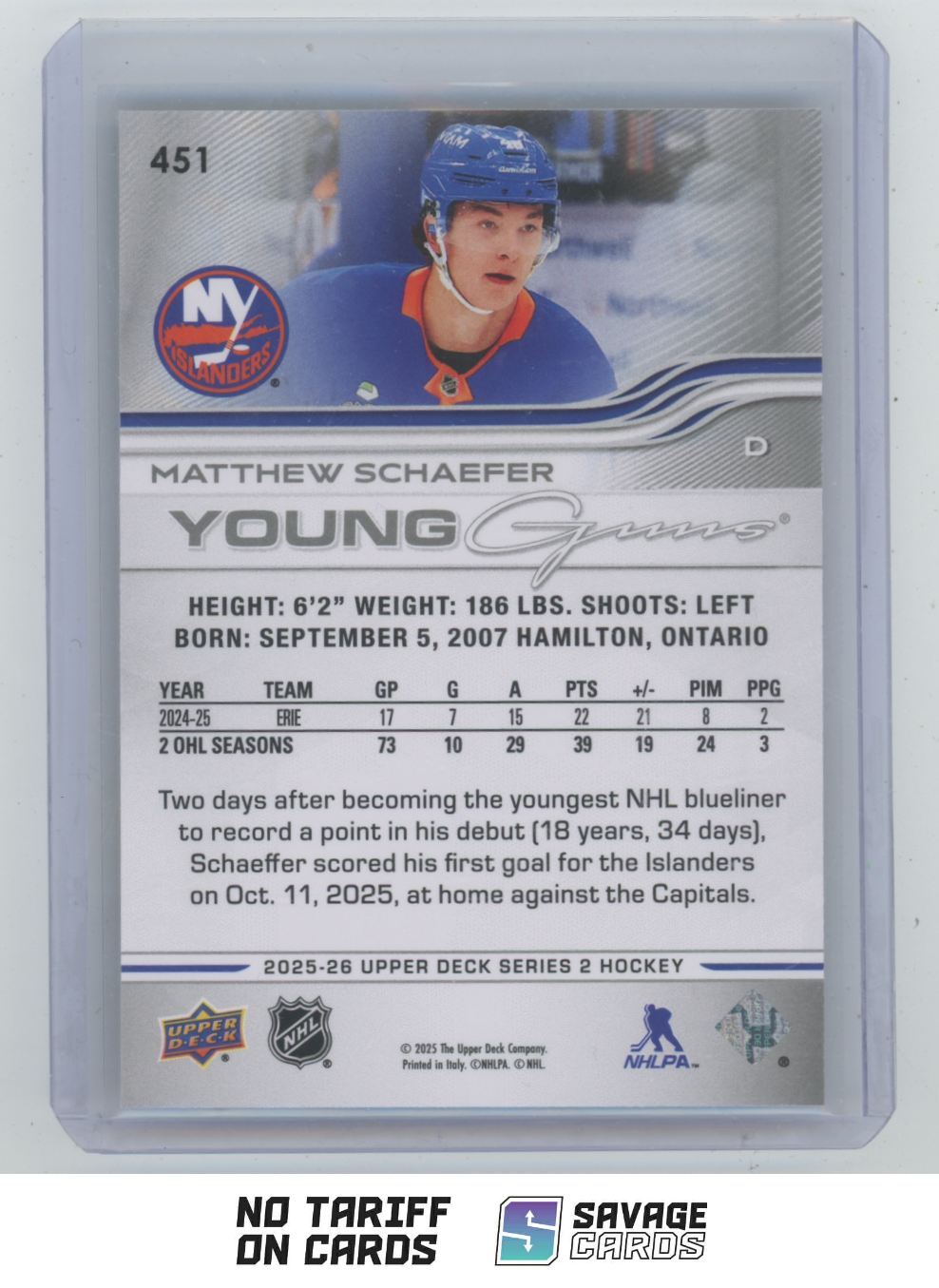 | 2025-26 Upper Deck Young Guns Matthew Schaefer #451 New York Islanders | ||||||||||||||||