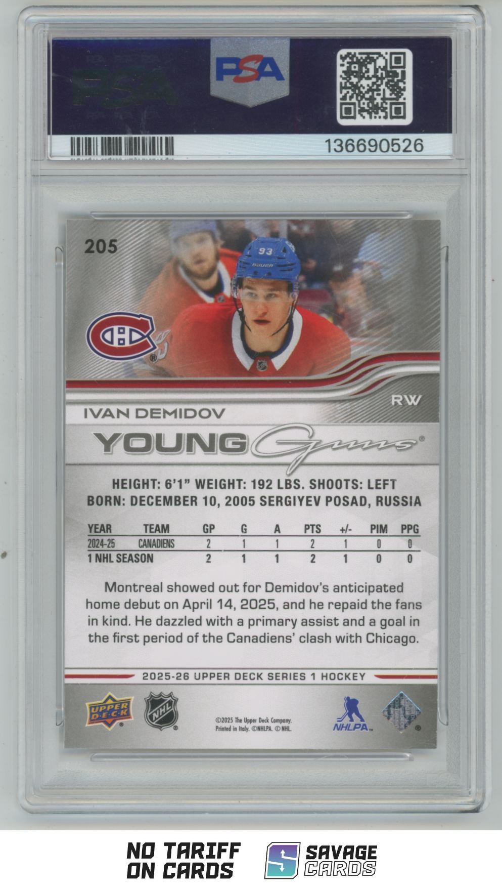 | 2025-26 Upper Deck Young Guns Ivan Demidov PSA 9 #205 Montreal Canadiens | ||||||||||||||||||