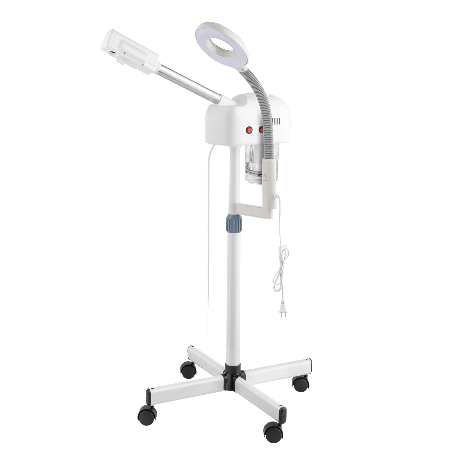 Features:1. HYDRATES SKIN: It produce ionic ozone that mixed with steam, it can improve your texture of skin. The steamer for facial is suitable for a variety of skin, help to deal with skin problems.2. ADJUSTABLE AND FLEXIBLE: The beauty tools facial steamer's casters won't get caught in the hairs and move quick smoothly, you can flexibly adjust the height of the beauty steamer machine and the angle of the beauty lamp when needed.3. MAGNIFYING LAMP: The facial steamer with agnifying lamp, high quality bright magnifying glass help you see details clearly and you will know the true state of your skin.4. PROFESSIONAL CHOICE: The beauty tools facial steamer is suitable for most types of skin (like dry, oily skin), ideal for salon spas and beauty clinic. It also suitable for gifts to others because of beautiful appearance and practical functions.5. Assembly :This professional face steamer was easy to put together. and it has an opening in front of where the steam comes out where you can add herbs or flowers for a even more spa like experienceSpecifications:1. Material: Abs、PC、Metal2. Color: White3. Voltage: 110V4. Power: 750W5. Plug Type: US Standard6.Water Reservoir Capacity :600ML7. Power Cable Length: 135CM8. Leg Diameter: 22.8 inch9. Max Height (Ajustable):47 inch10. Weight: 3.8KGPackage Includes:1 x 2 in1 Facial Steamer & Magnifying Lamp1 x Manual
