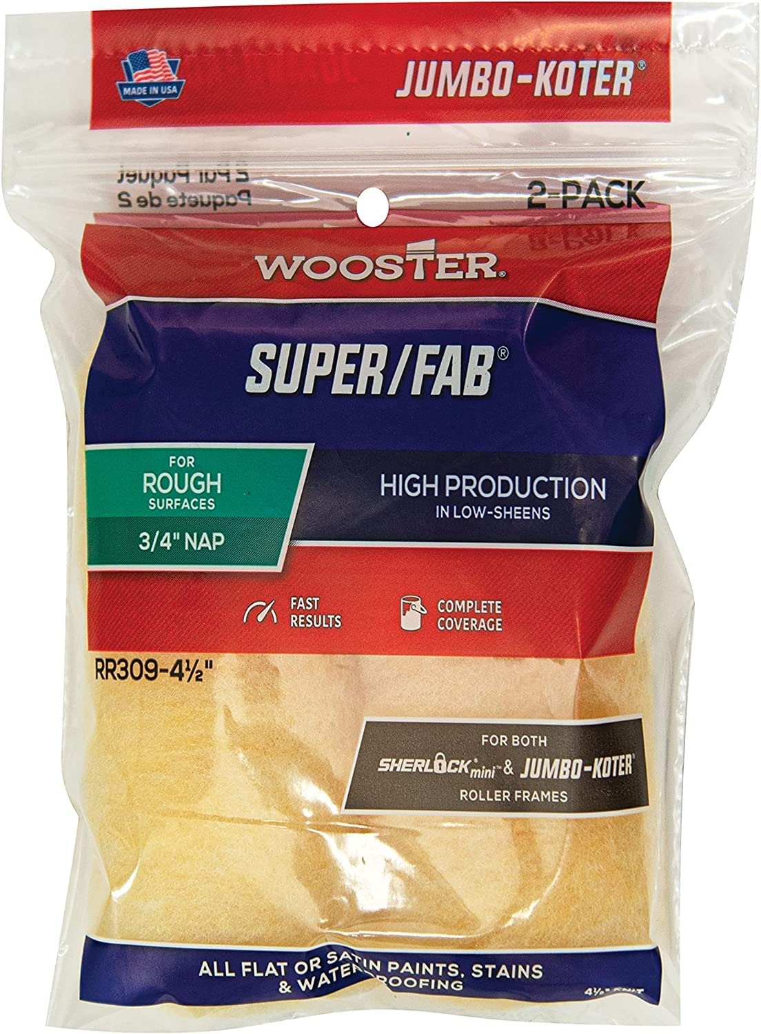 Includes (2) RR309 4.5 inch Roller covers. 4.5" long roller cover with 3/4" Nap. Offers exceptional capacity with all flat, eggshell or satin paints, stains, waterproofing. Golden yellow fabric, exclusively from Wooster, resists matting for complete coverage, smoother results. Use with RR028, RR013, RR014, RR323, R212, Jumbo-Koter roller frames.