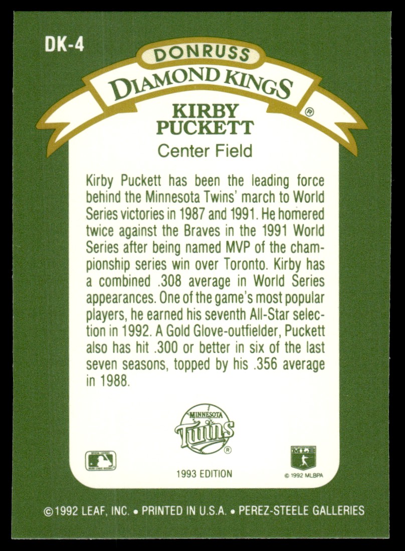 | 1993 Donruss Diamond Kings Kirby Puckett #DK-4 |