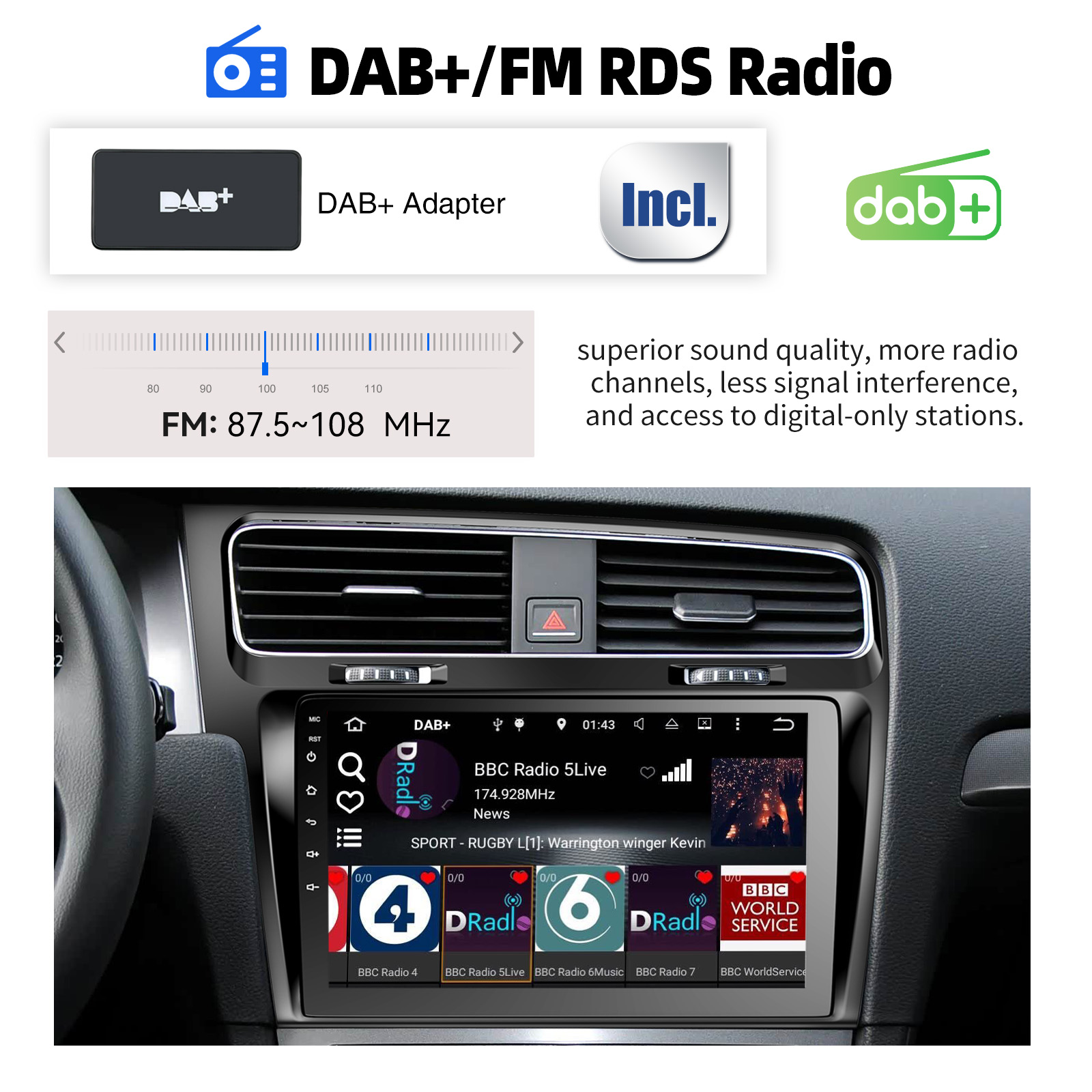 Radio Data System (RDS): RT, AF, TA provides all the FM channel information you need(europe).