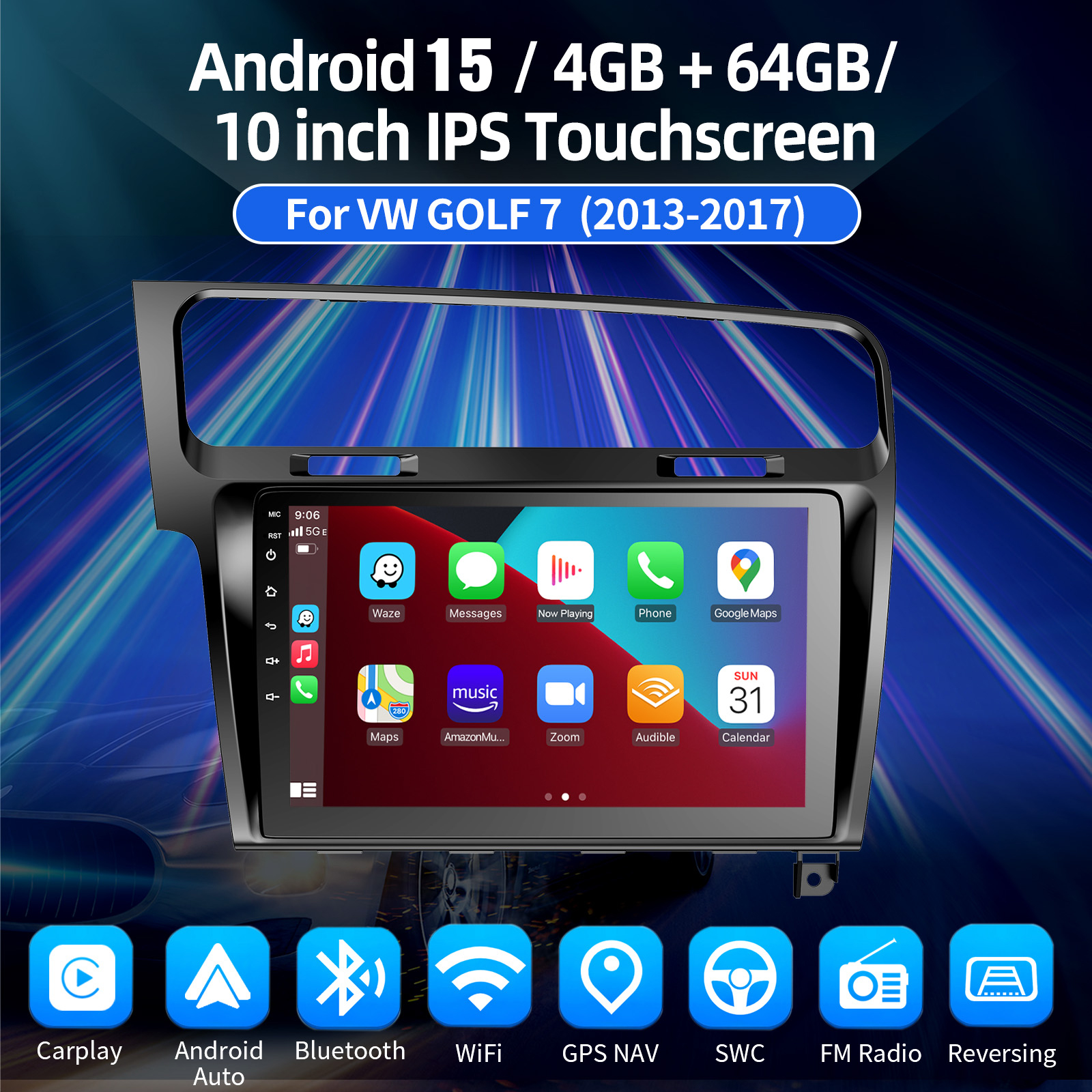 10 Inch Android 14 Car Radio VW Golf 7: The Android car radio with 10" 1280* 720 HD capacitive touchscreen, 4GB RAM and 64GB ROM allows you to download your favorite apps and videos, so driving is no longer boring. No extra frame, no cable change, plug and play. It comes with Canbus and supports most of the original functions: steering wheel control, reverse signals and reading original computer data, etc.