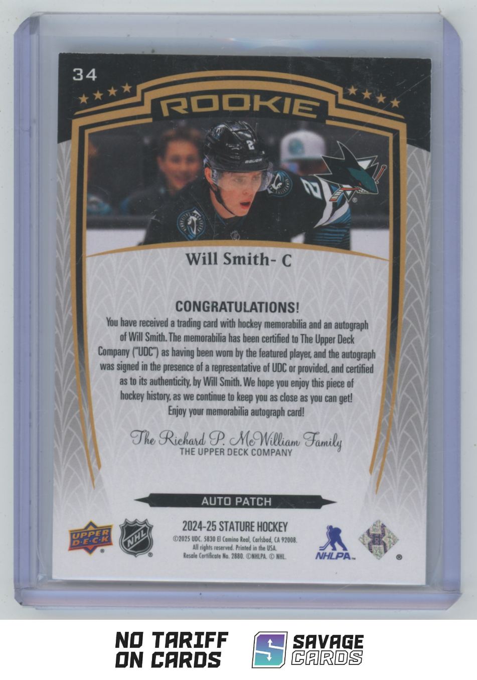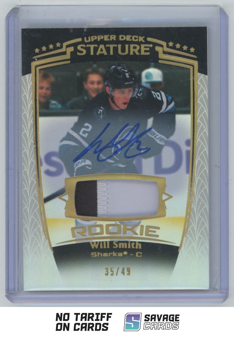 | 2024-25 Upper Deck Stature Rookie Auto Patch Will Smith /49 #34 San Jose Sharks | ||||||||||||||||||