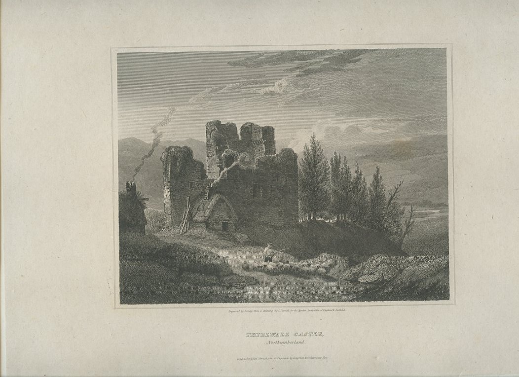 Northumberland; near Greenhead. Overall size approx. 310mm x 240mm, engraved print area approx.185mm x 145mm; with extra border where the vellum backing overlaps. Engraved by J.Greig for Sir Walter Scott's Essays on Scottish Border Antiquities.