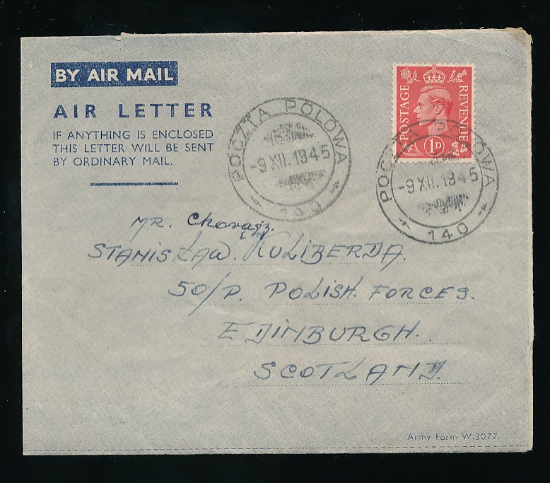 GB KG6th 1d used on postal stationery Air Letter from Polish Forces; to Edinburgh; Field Post Office 140 cancels.