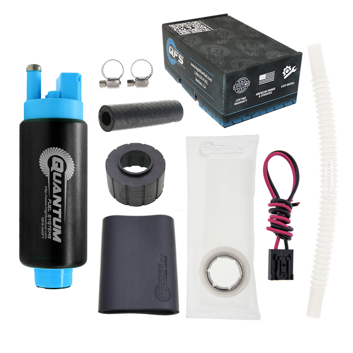 High Flow Fuel 340LPH Fuel Pump w/ Installation Kit - Automotive Performance: QFS-340FT-510 Quantum replacement Fuel Pump are designed to meet or exceed OEM specifications with feature upgrades that improve on the OEM design. Upgraded polymers, brushes, and commutators ensure long life and durability in multiple fuel blends.