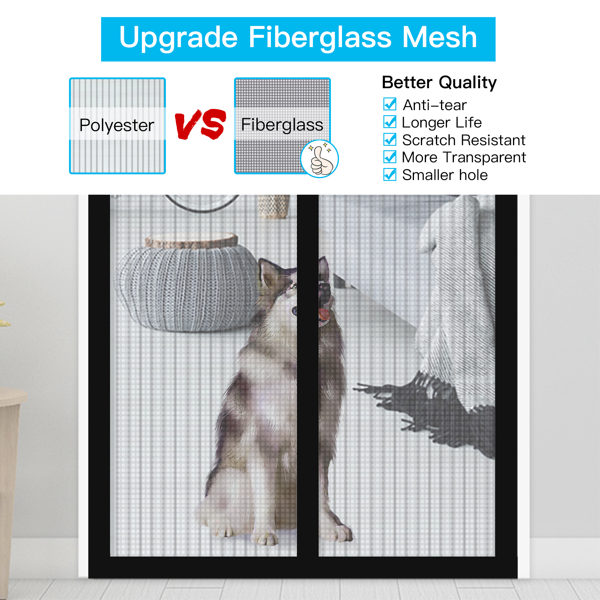 This upgraded version magnetic screen door used fiberglass mesh, ventilation design, so you can still enjoy cool breeze when you enjoy good afternoon tea or rest time indoors. 0.79" dense grid makes pesky flying objects not enter the house.
