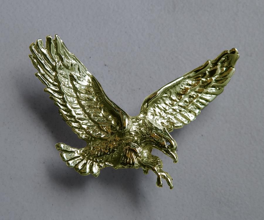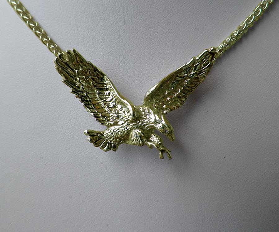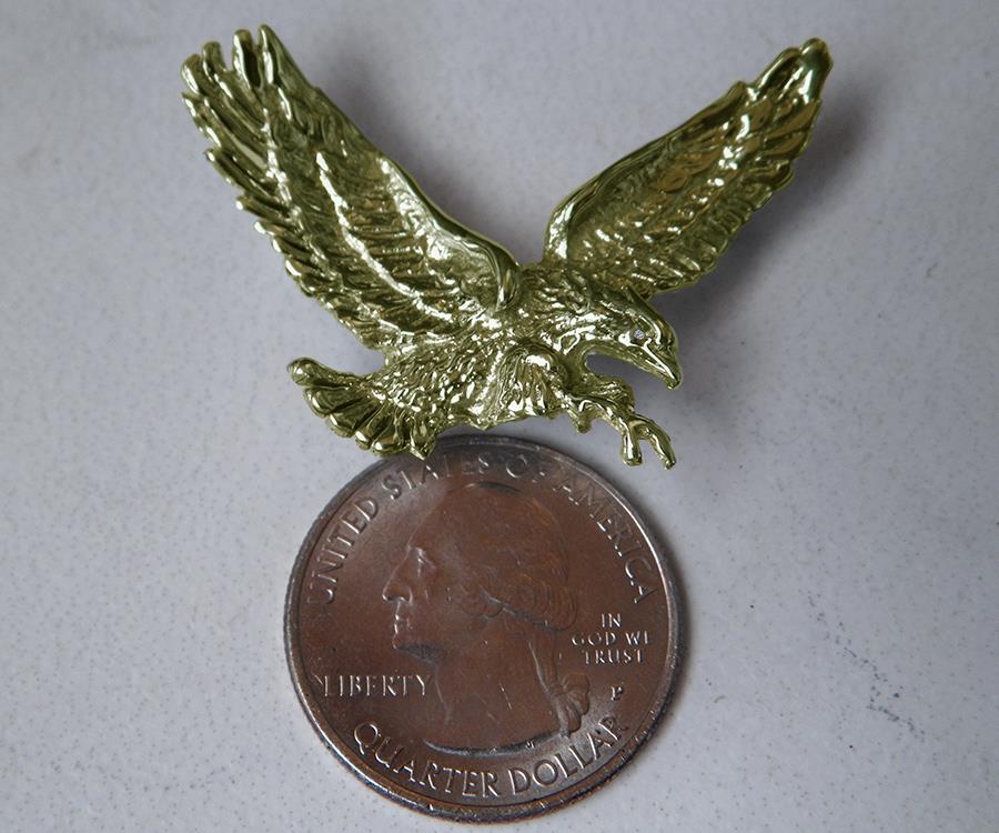 | | | | | | | Very beautiful solid 14k gold American eagle pendant. Made with beautiful design details and a single 2pt VS2 diamond in the eye. This beauty can be worn by both men and women, and will look great with any gold chain. Pendant specs: * Eagle is 40mm wide, by 24 mm tall. * Weight approximately 7.4 grams of solid 14K gold. * Diamond weight is 2pt and VS2 Clarity.