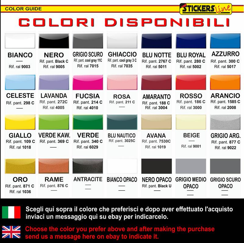 *Invia il tuo disegno o le scritte che intendi realizzare in adesivo, a questo indirizzo: stickersline@gmail.com indicando chiaramente le misure altezza e lunghezza, il colore, e la quantità degli adesivi da realizzare, RICEVERAI PRESTO UN PREVENTIVO.