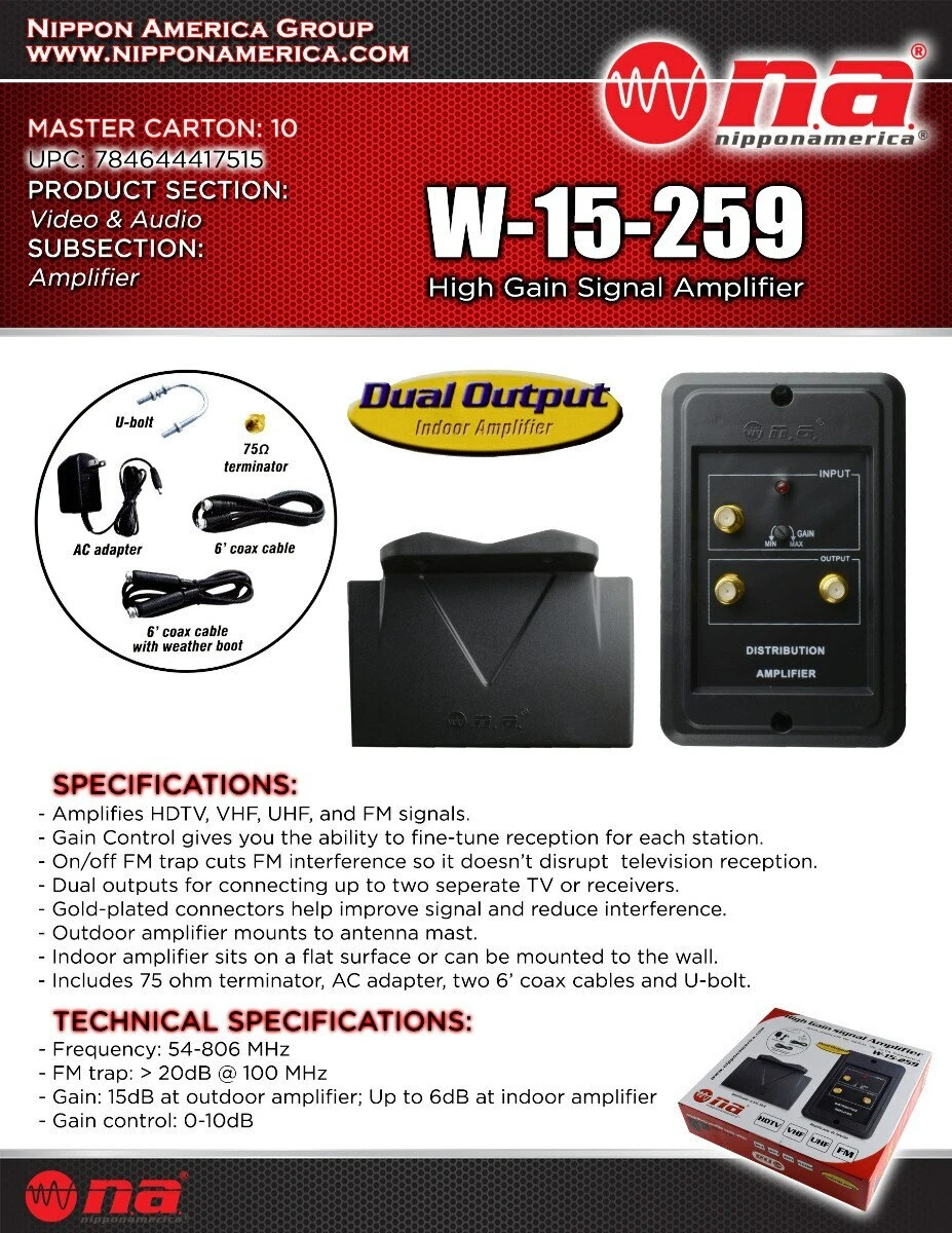 | Gain | 15dB outdoor amplifier/6dB max indoor amplifier |