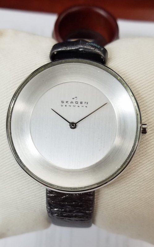 Watch Information: Gender: Women's Case Size: 38mm Dial Color: Silver Material Case: Stainless Steel Material Band: Genuine Leather Diamonds: n/a Movement: Analog Quartz Water Resist: 30 Meters Water Resistant Features: Water Resistant Additional Info: Packaging: Skagen Box & Papers