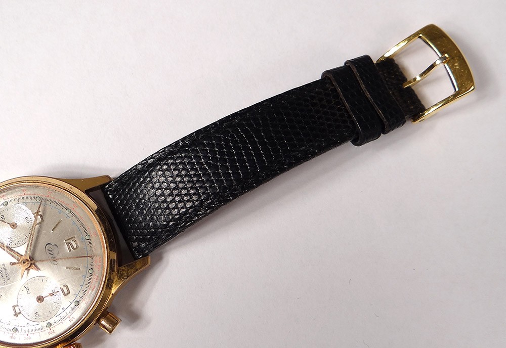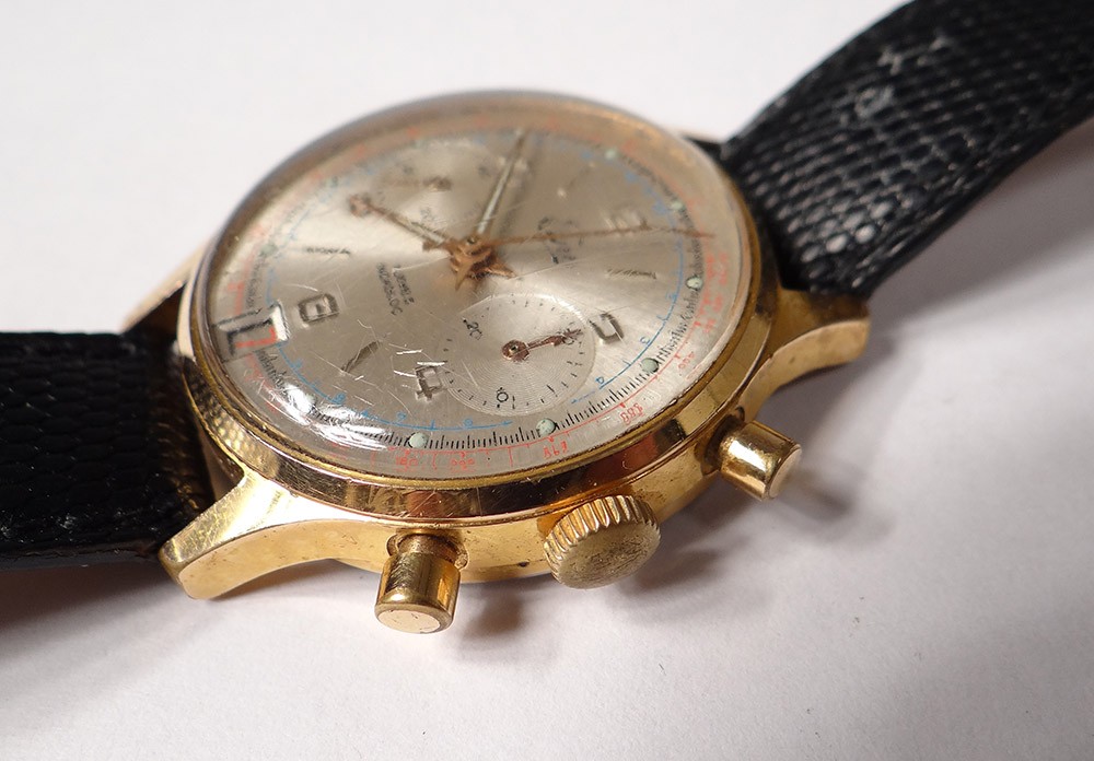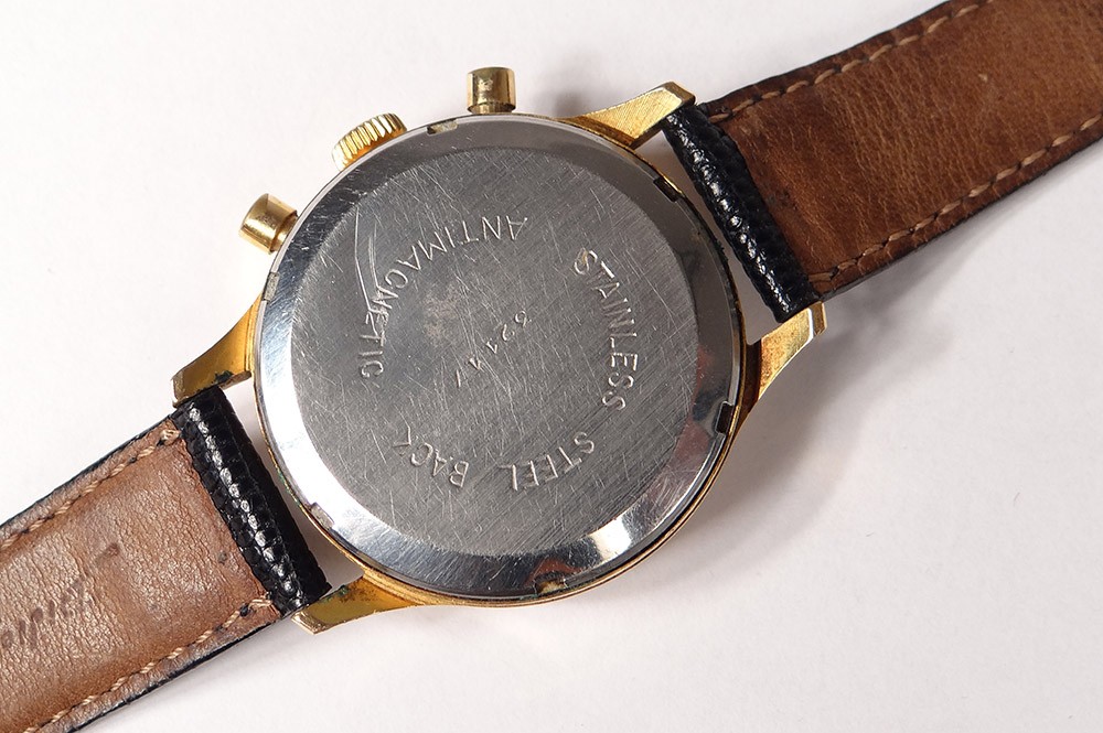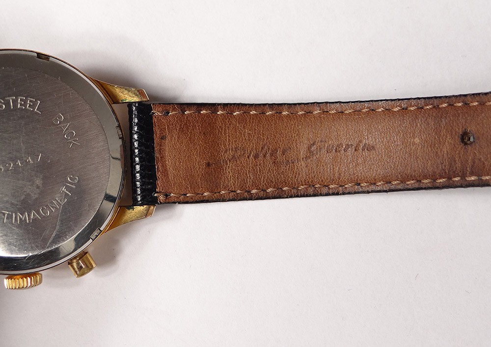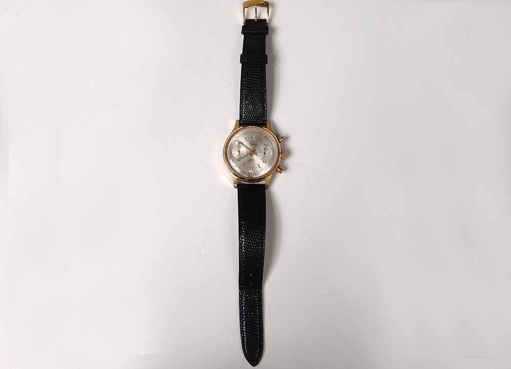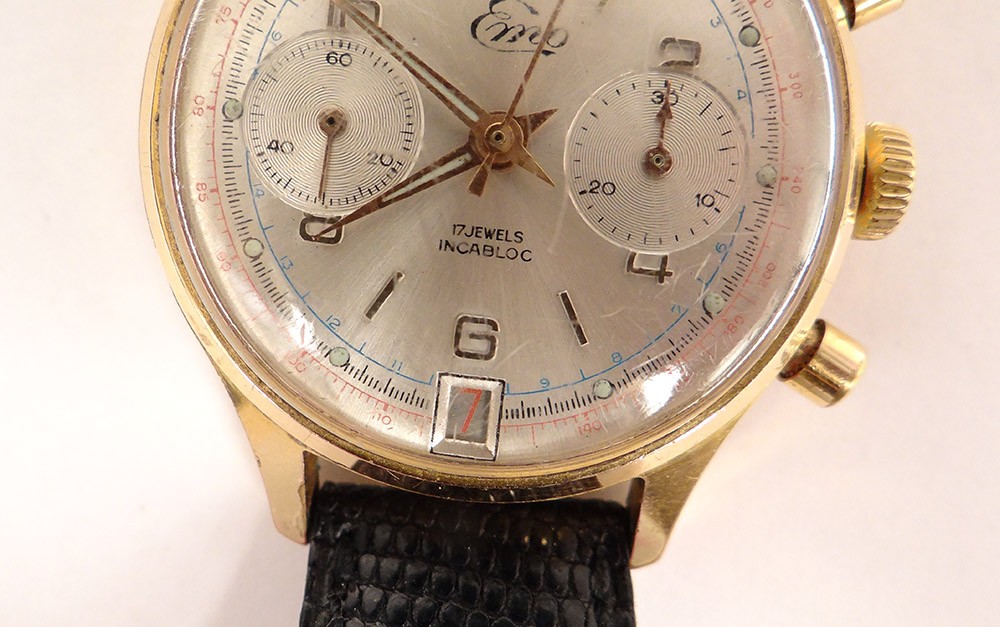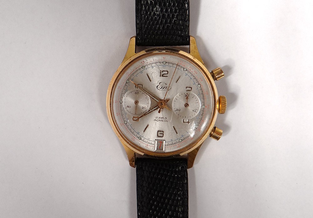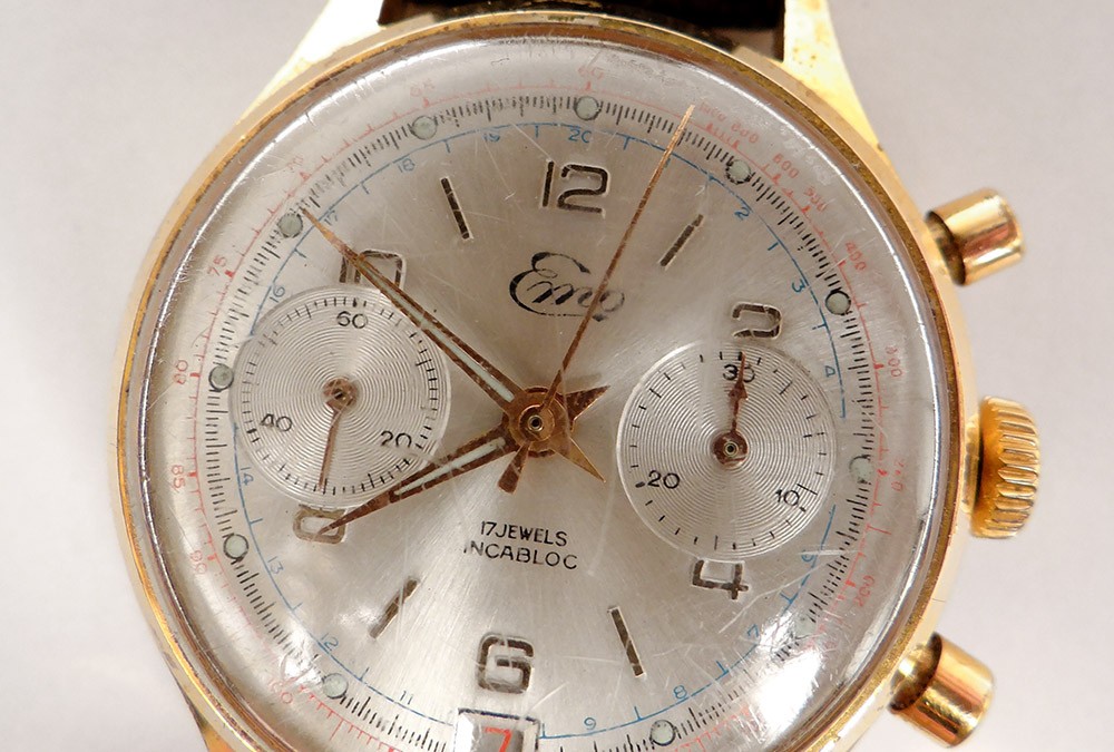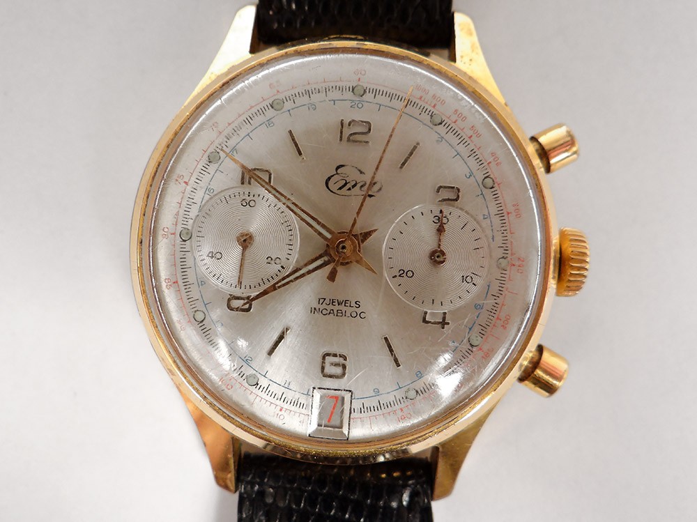 Montre bracelet chronographe en acier, de la marque suisse Emo, cadran à deux compteurs et date, remontage manuel, d'époque XXème siècle.