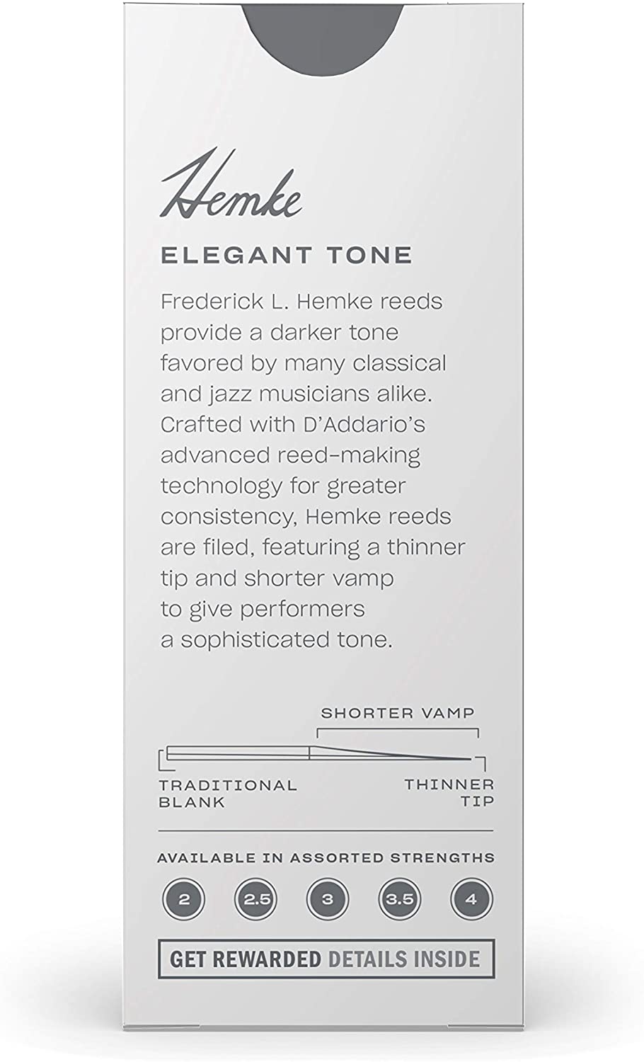 Frederick L. Hemke reeds are filed and feature a thinner tip and shorter vamp for ease of response. They are a favorite among jazz and classical players alike; they are also popular with advancing students. Rico's updated reed-making machinery and state-of-the-art process have made today's Hemke reed more consistent than ever before.
