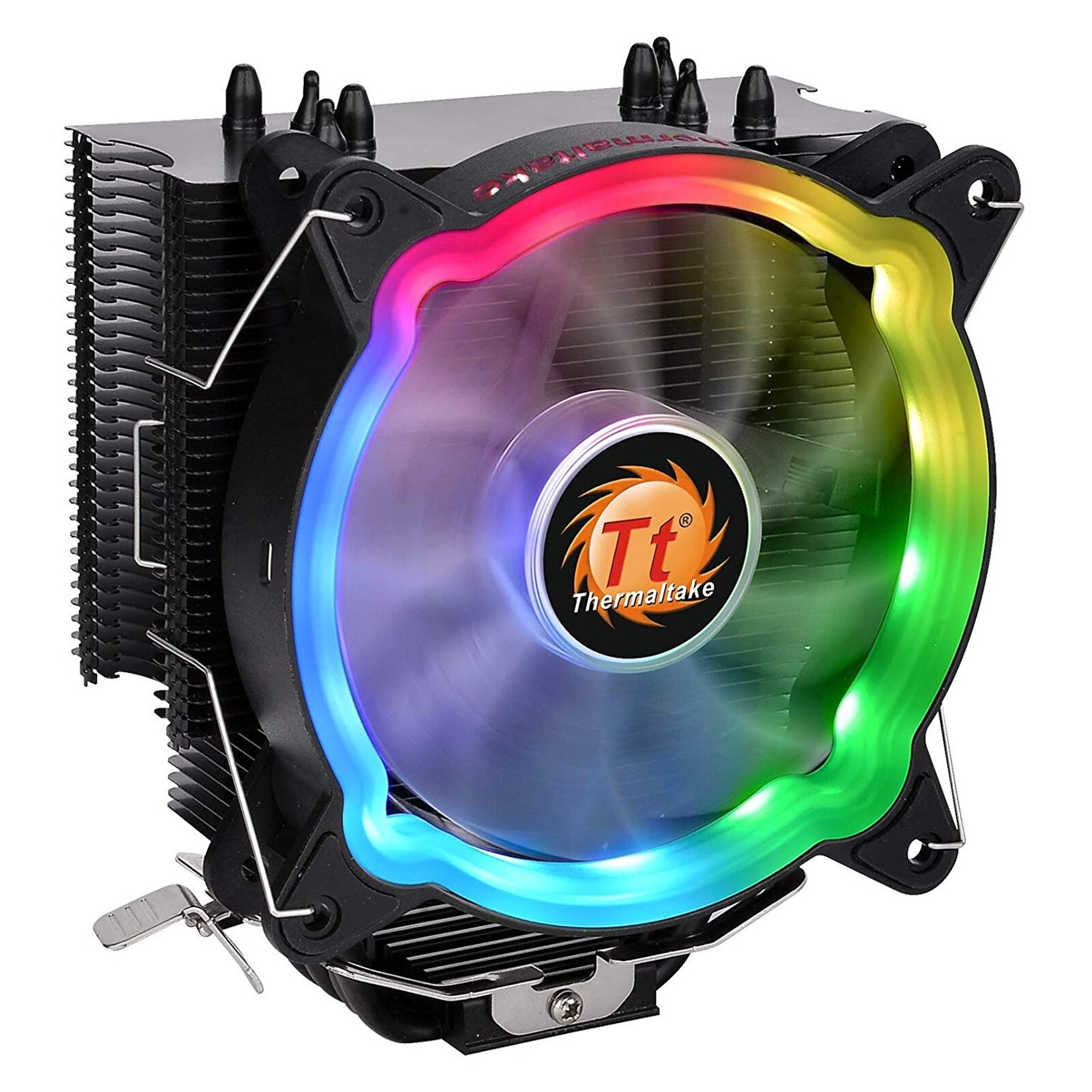 Made for PC enthusiasts and gamers, ThermalTake Riing Silent 12 RGB Sync Edition is a powerful, yet silent CPU cooler that features 0.4mm thick aluminium fins and 4 direct touch heatpipes for effective heat dissipation. The integrated 120mm PWM fan comes with high airflow design and a patented RGB LED ring that is controlled directly via motherboard RGB software including ASUS Aura Sync, ASRock RGB LED, BIOSTAR Vivid LED DJ, GIGABYTE RGB Fusion and MSI Mystic Light Sync. Supporting all the latest Intel and AMD CPU socket, Riing Silent 12 RGB gives you excellent cooling and whisper-quiet performance!