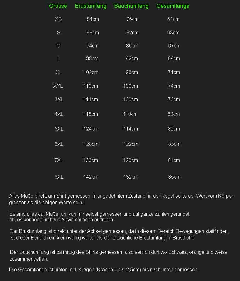 Wer denkt mit einem anliegenden UV Shirt, irgendwelche...sagen wir mal "Rettungsringe" zu kaschieren...klappt aus eigener Erfahrung leider nicht :-) Benötigt ihr das Shirt um "Rettungsringe" zu kaschieren, so einfach den Brust- und Bauchumfang eines eigenen und bequemen T-Shirts ausmessen und versuchen auf die selben Werte von diesem UV-Shirt zu kommen. Kann dann also durchaus sein, dass wenn normalerweise zb. 3XL getragen wird, dass UV Shirt dann plötzlich bei 8XL liegt (die schlabbernde Variante)