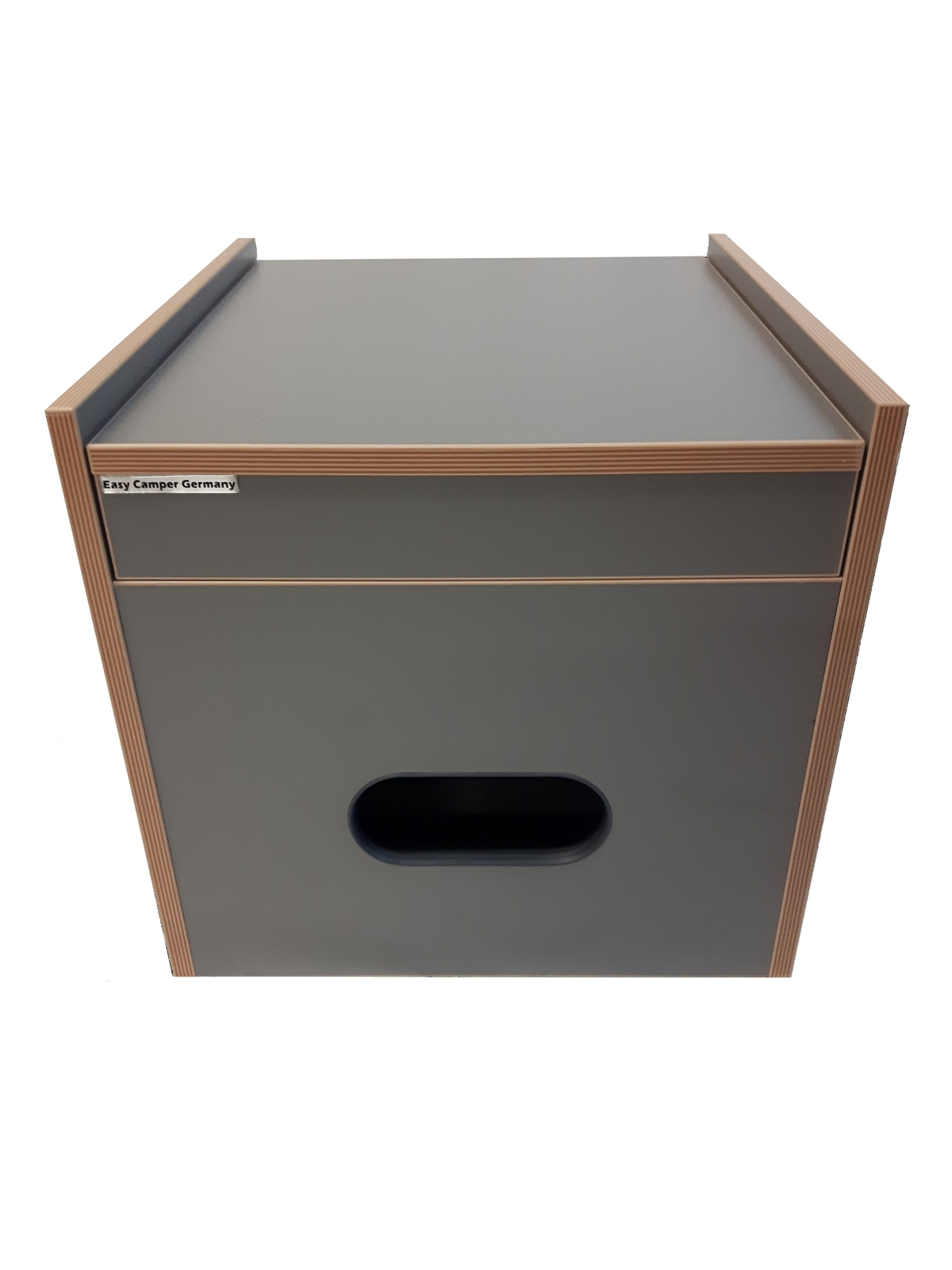 Der Hocker bietet einen weiteren Sitzplatz in Ihrem Camper - als eine elegante Verpackung für Ihre Porta Potti Toilette: weisse CPL-Beschichtung mit Kanten-Umleimer in Holzoptik und Polster in schwarz.