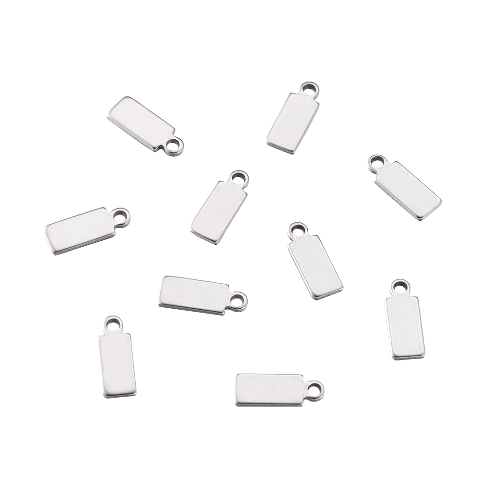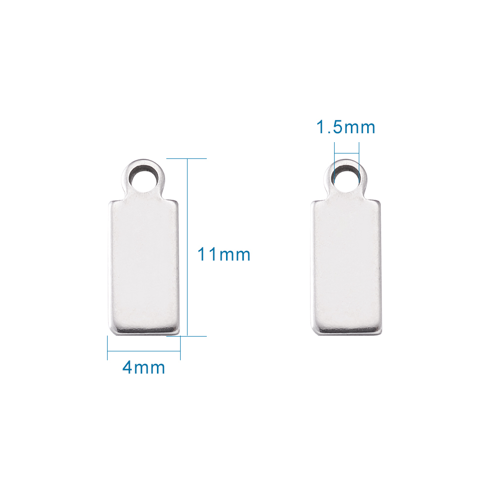 304 Stainless Steel Blank Stamping Tag Pendants,Smooth Surface,Metal Charms,For DIY Craft Bracelet Necklace Jewelry Making. Shape:Rectangle Size: about 11mm long, 4mm wide, 0.6mm thick, hole: 1.5mm. Stainless steel takes a high polish and has a luster similar to sterling silver. It stays bright and shiny for years of long wear. Its stainless character make it can be used longer thus its service life is prolonged. You can use it to make necklaces, mobile chains, bag chains and other decorations. Priced per 100 pcs Pendants