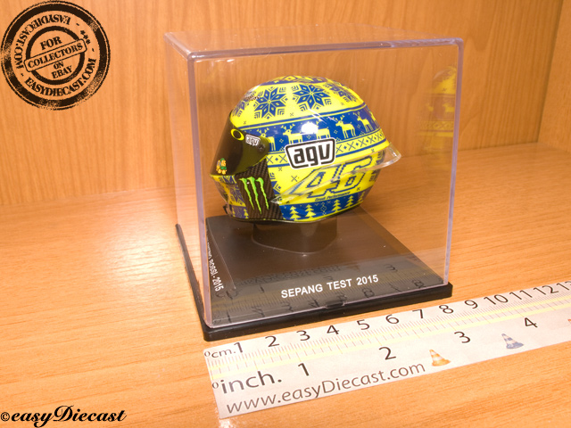 RARE scale 1:5 *VALENTINO ROSSI - SEPANG TEST - 2015 AGV HELMET MONSTER #46* . Mint condition. From the official "Moto-GP Helmets" spanish Altaya series. Few units made. Includes pedestal with the name of the helmet, etc... Size: 8,5cm(3,3in) x 8,5cm(3,3in) x 8,5cm(3,3in) aprox. Great level detail, high quality components, made with ABS (the same material of authentic helmets) , tampographied details, with folding helmet visor, don't miss it!!!. Check my other auctions for more street and competition bikes, click to see more Valentino Rossi bikes or only Moto-GP helmets of these series. International bidders are welcome. I ship worldwide, I can accept GBP, U.S.$ or EUR. I accept Paypal!!! Good luck!!!