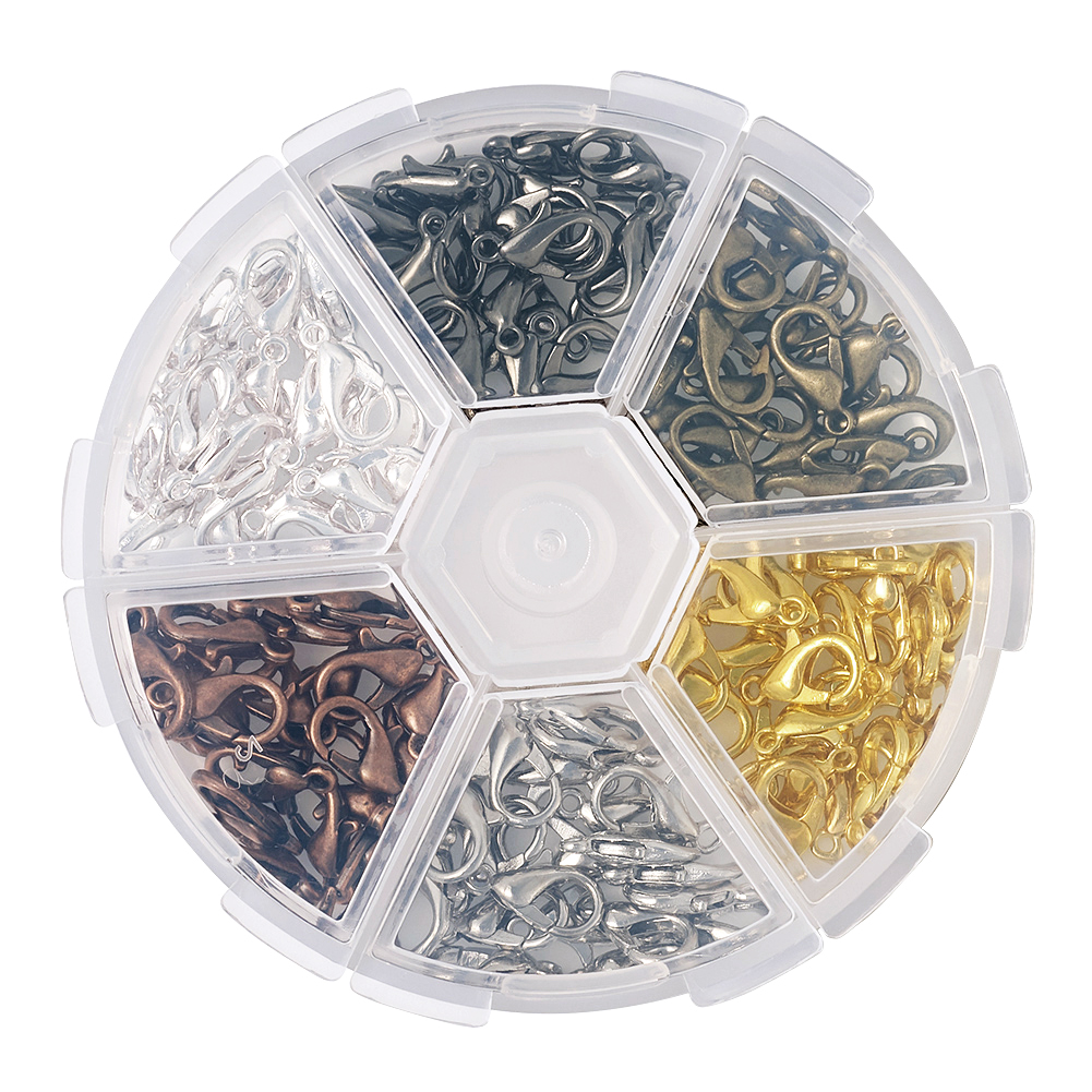 1 Box 240PCS 6 Colors Zinc Alloy Lobster Claw Clasps, Mixed Color Size: about 6mm wide, 10mm long, hole: 1mm; about 40pcs/compartment, 240pcs/box. Size: about 7mm wide, 12mm long, hole: 1.2mm, about 20pcs/compartment. Size: about 8mm wide, 14mm long, hole: 1.2mm, about 20pcs/compartment. Priced per 1 Box Please Note: The color may be slightly different from the picture because of different display device. |