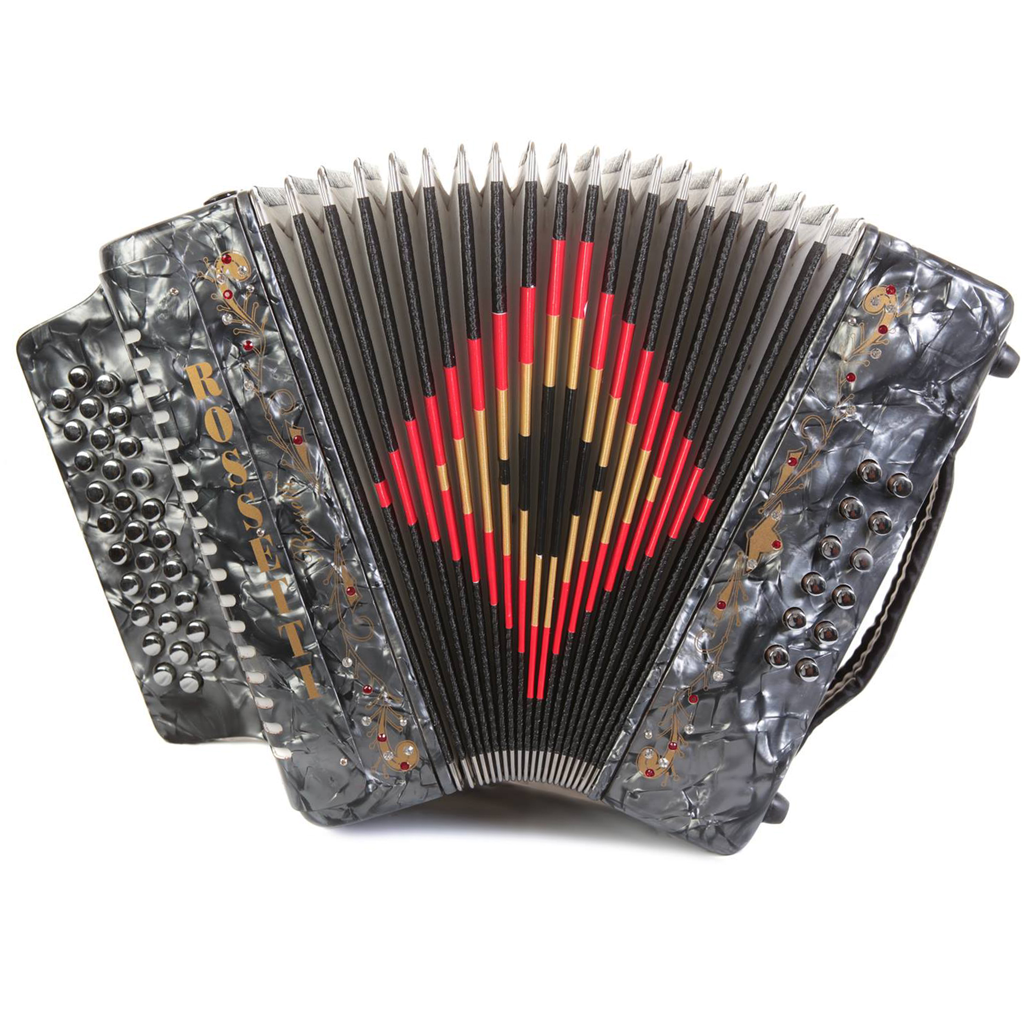 This beautiful Rossetti 3112 Button Accordion with its Italian Style decorations and bright pearlescent finish comes in several colors. The bellows are 20 fold in size for bigger sound and have sheepskin corners for longer life. There are single straps hooks on each side of the accordion with plenty of room for the two extra-long leather padded shoulder straps. The accordion also includes an adjustable left hand strap. We use an upgraded button mechanism designed to keep buttons moving freely with no sticking. Pearl buttons and a custom grill design offer a beautiful touch. The acoustically designed grill cloth provides a bigger sound than most other comparable accordions. A slide lever air valve makes for faster air intake. The accordion comes in a premium case with lock and logo.