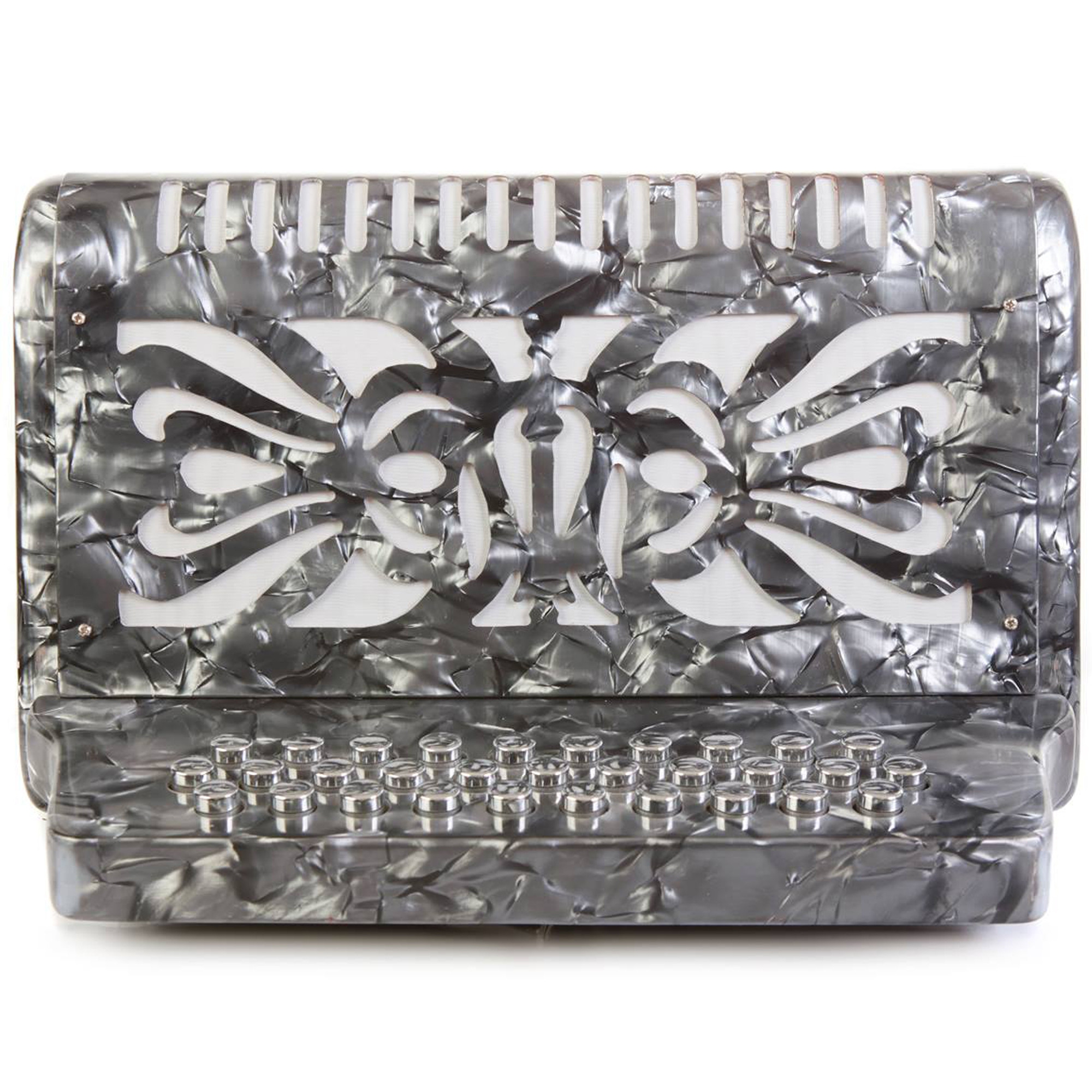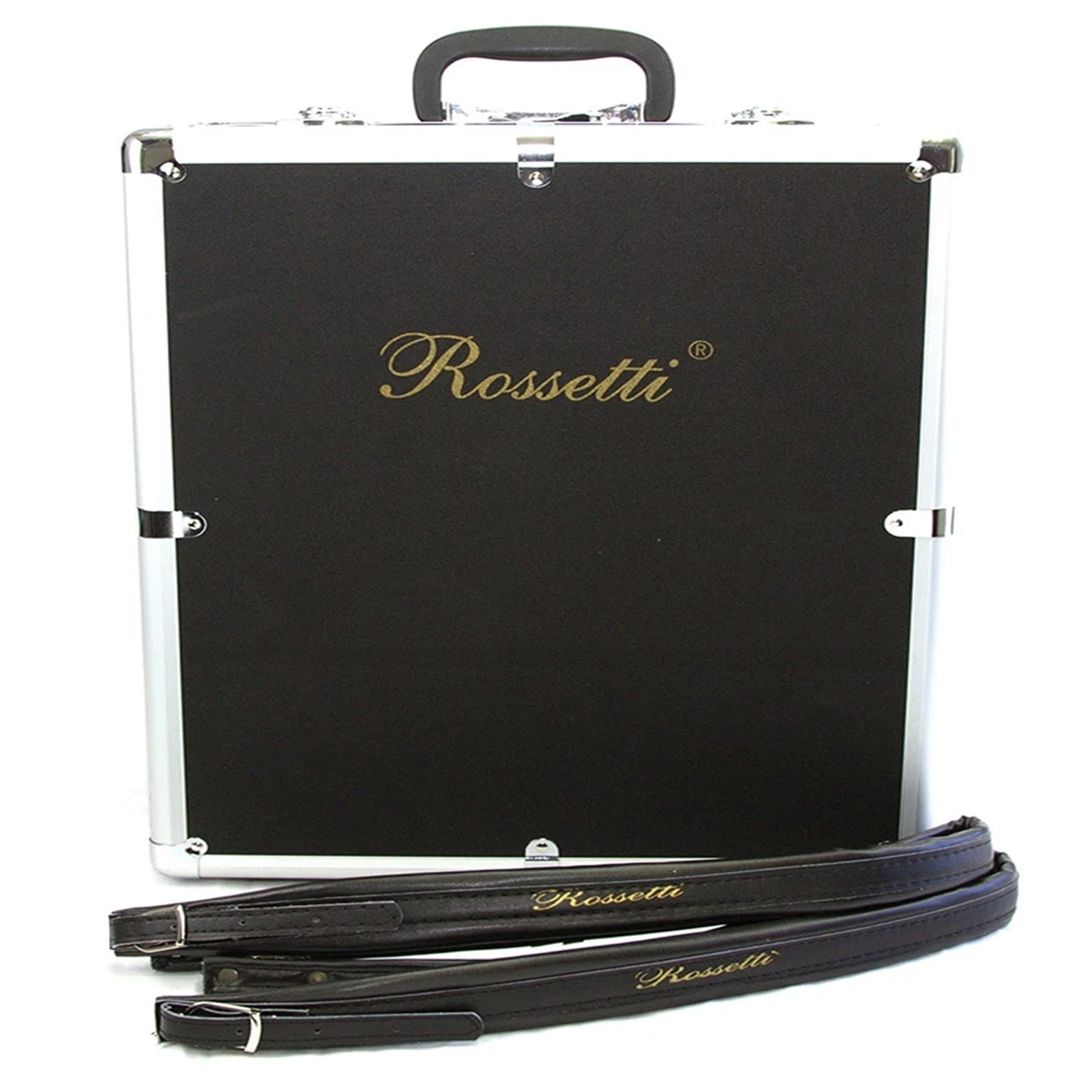 This beautiful Rossetti 3112 Button Accordion with its Italian Style decorations and bright pearlescent finish comes in several colors. The bellows are 20 fold in size for bigger sound and have sheepskin corners for longer life. There are single straps hooks on each side of the accordion with plenty of room for the two extra-long leather padded shoulder straps. The accordion also includes an adjustable left hand strap. We use an upgraded button mechanism designed to keep buttons moving freely with no sticking. Pearl buttons and a custom grill design offer a beautiful touch. The acoustically designed grill cloth provides a bigger sound than most other comparable accordions. A slide lever air valve makes for faster air intake. The accordion comes in a premium case with lock and logo.