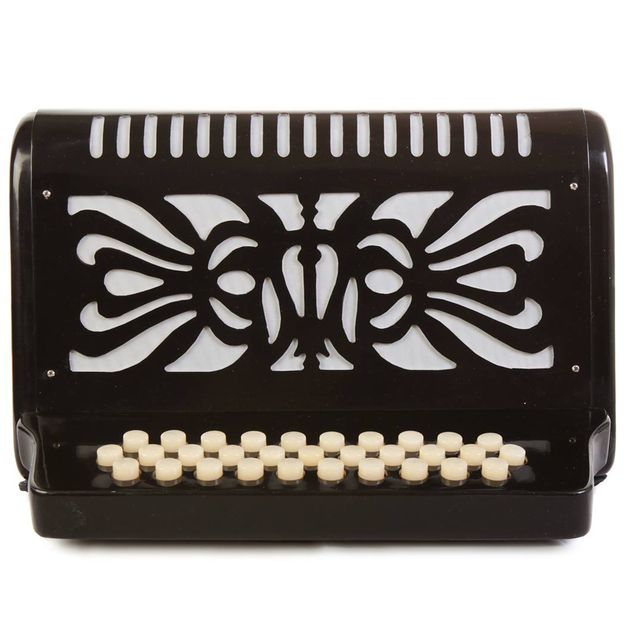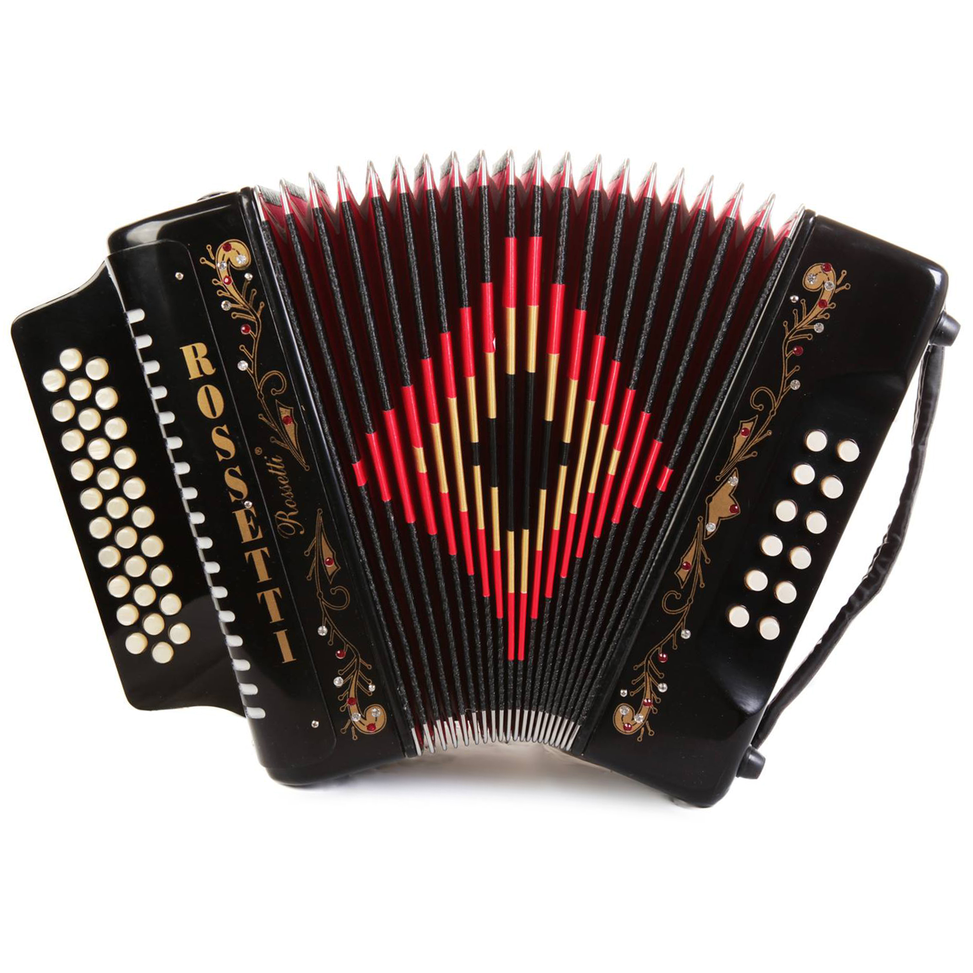 This beautiful Rossetti 3112 Button Accordion with its Italian Style decorations and bright pearlescent finish comes in several colors. The bellows are 20 fold in size for bigger sound and have sheepskin corners for longer life. There are single straps hooks on each side of the accordion with plenty of room for the two extra-long leather padded shoulder straps. The accordion also includes an adjustable left hand strap. We use an upgraded button mechanism designed to keep buttons moving freely with no sticking. Pearl buttons and a custom grill design offer a beautiful touch. The acoustically designed grill cloth provides a bigger sound than most other comparable accordions. A slide lever air valve makes for faster air intake. The accordion comes in a premium case with lock and logo.
