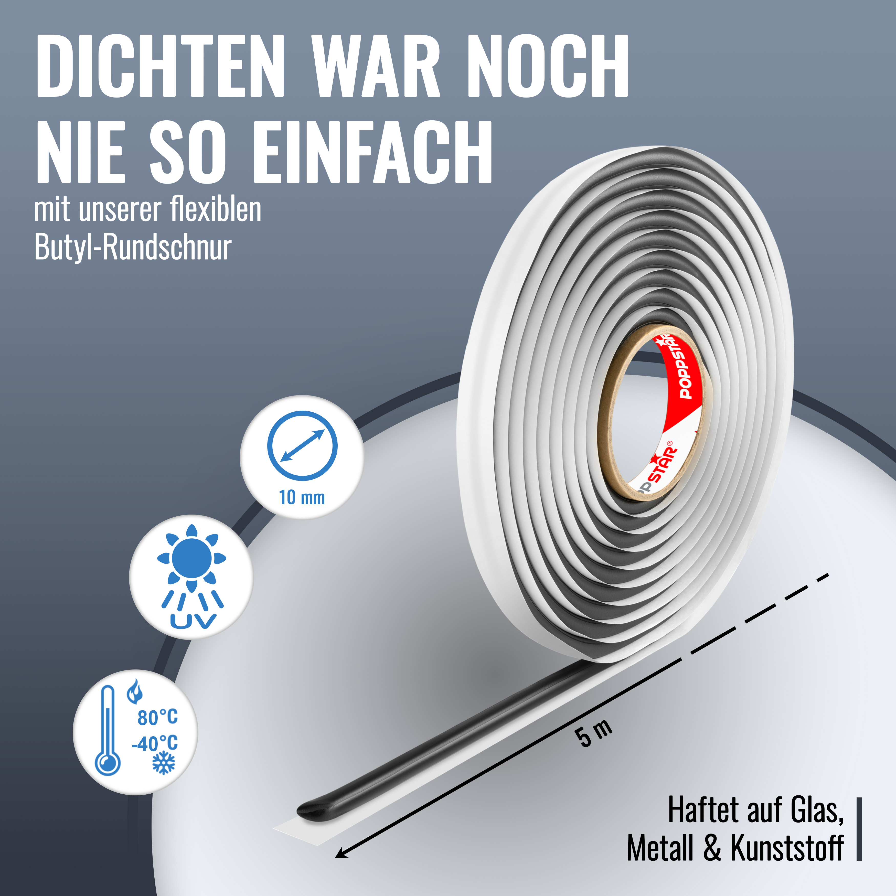 Die Poppstar Butylrundschnur ist kaltverschweißend und einfach zu verarbeiten. Durch ihre besonderen Materialeigenschaften ist sie witterungsbeständig, wasserdicht, flexibel und sehr gut verformbar. Zudem haftet die Rundschnur sehr gut auf einer Vielzahl von Materialien / Untergründen, z.B. auf Glas, Plastik oder Metall. Dabei ist sie UV-beständig und dauerplastisch.