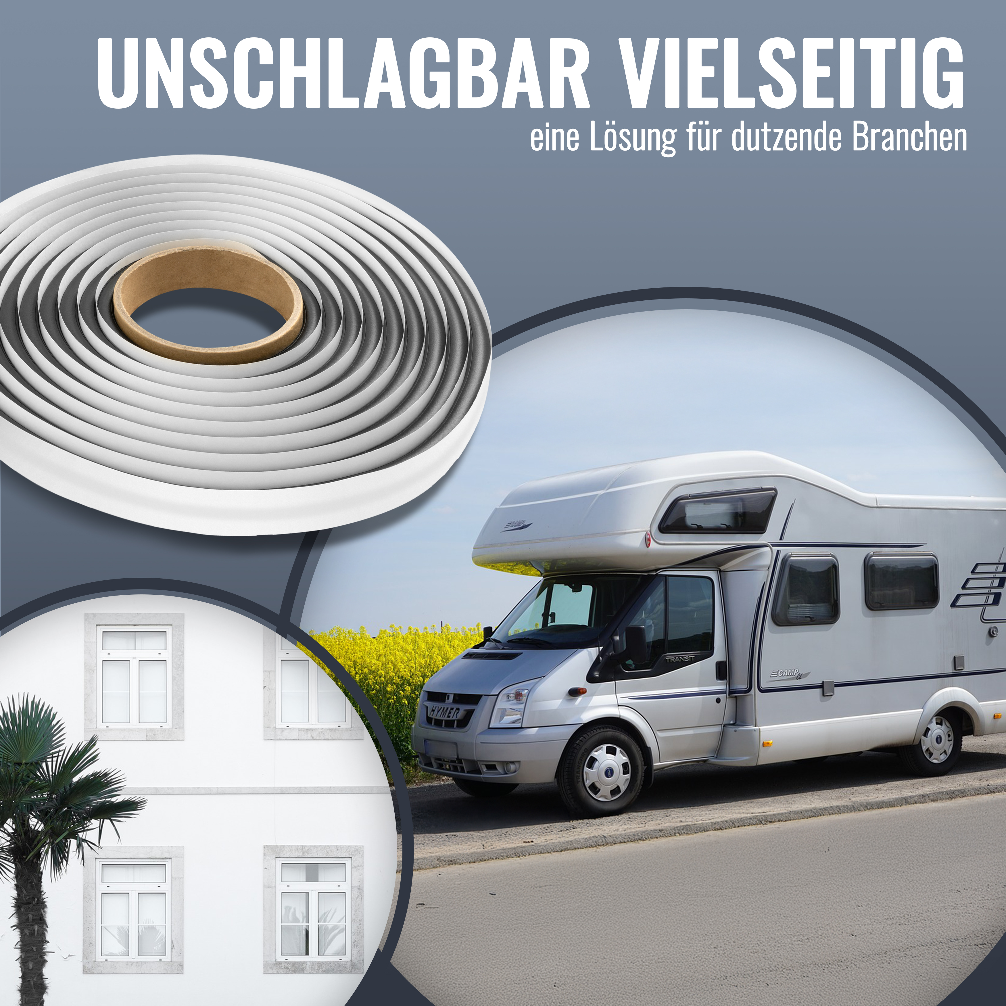 Das Band bzw. die Schnur gibt es in den Ausführungen: Einseitig klebend mit Alukaschierung, doppelseitig klebend und wie hier als Butyl-Rundschnur.