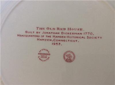 This is a Wedgwood 10 1/2" red historical plate picturing the Old Red House built by Jonathan Dickerman in 1770. It houses the Hamden, Connecticut historical society, about 15 minutes from my house. We had a tornado come through last month. It came right through Quinnipiac University where the house is located and I don't know if it's still standing. That being said, the plate was made in 1953 and is in excellent, like new condition with no chips, cracks, crazing or flaws of any kind.