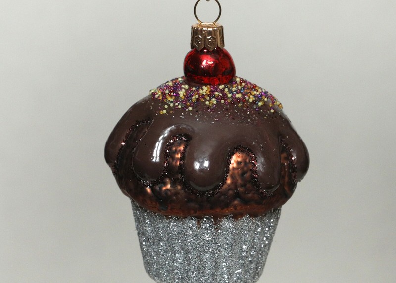 This is a new IMPULS Glass Ornament in the CHOCOLATE CUPCAKEe w/CHERRY ON TOP pattern.