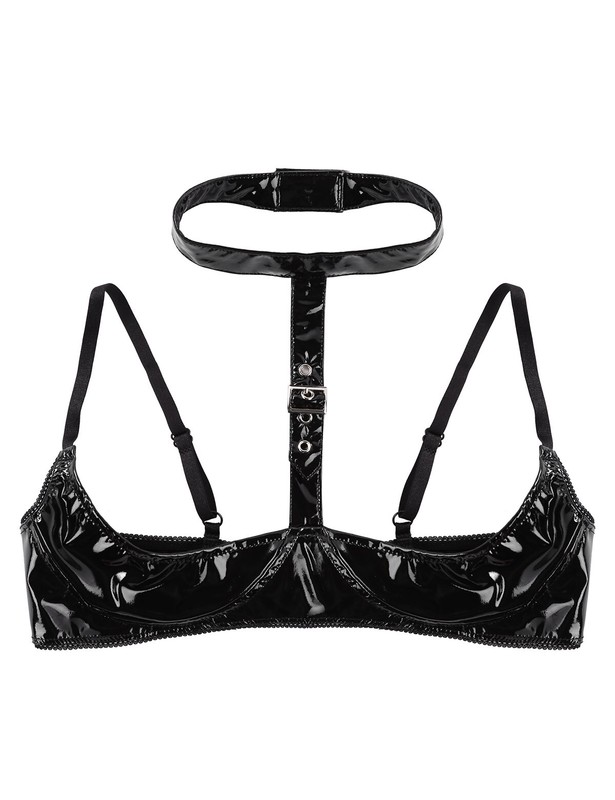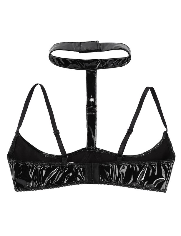 Women’s wet look patent leather bra top lingerie, wire-free and unlined design.
