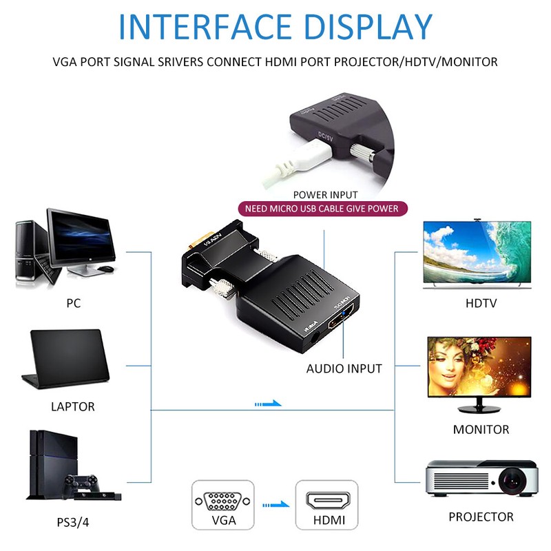 The HDMI to VGA adapter supports video resolutions up to full 1080P, making it a convenient option for high-definition applications, and features a compact design with no external power source, which ensures a portable solution that’s easy to carry as an accessory.