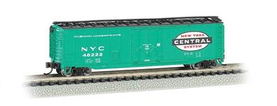 UP FOR SALE IS A BRAND NEW "N GAUGE" BACHMANN "SILVER SERIES" 50' PLUG DOOR BOX CAR-THIS ONE IS COLORED BLACK OVER GREEN WITH WHITE LETTERING-IT DISPLAYS NEW YORK CENTRAL RAILROAD MARKINGS ON BOTH SIDES OF THE CAR--ROAD #48222