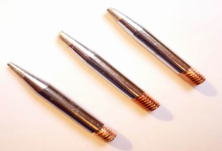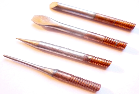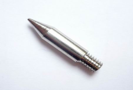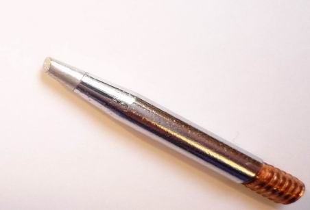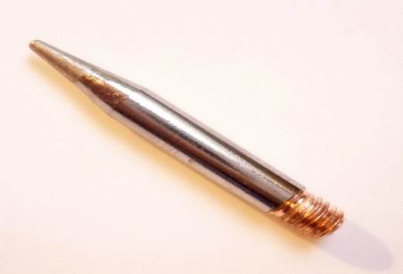 - Ø Gewinde: ca. 3,8 mm, Spitze Bleistiftform mit Kupfergewinde ca. Ø 1,0 mm x 30 mm Länge, Gewindelänge: ca. 5 mm, Länge Spitze: 9 mm, Material: Kupferkern, überzogen mit einer Eisenschicht