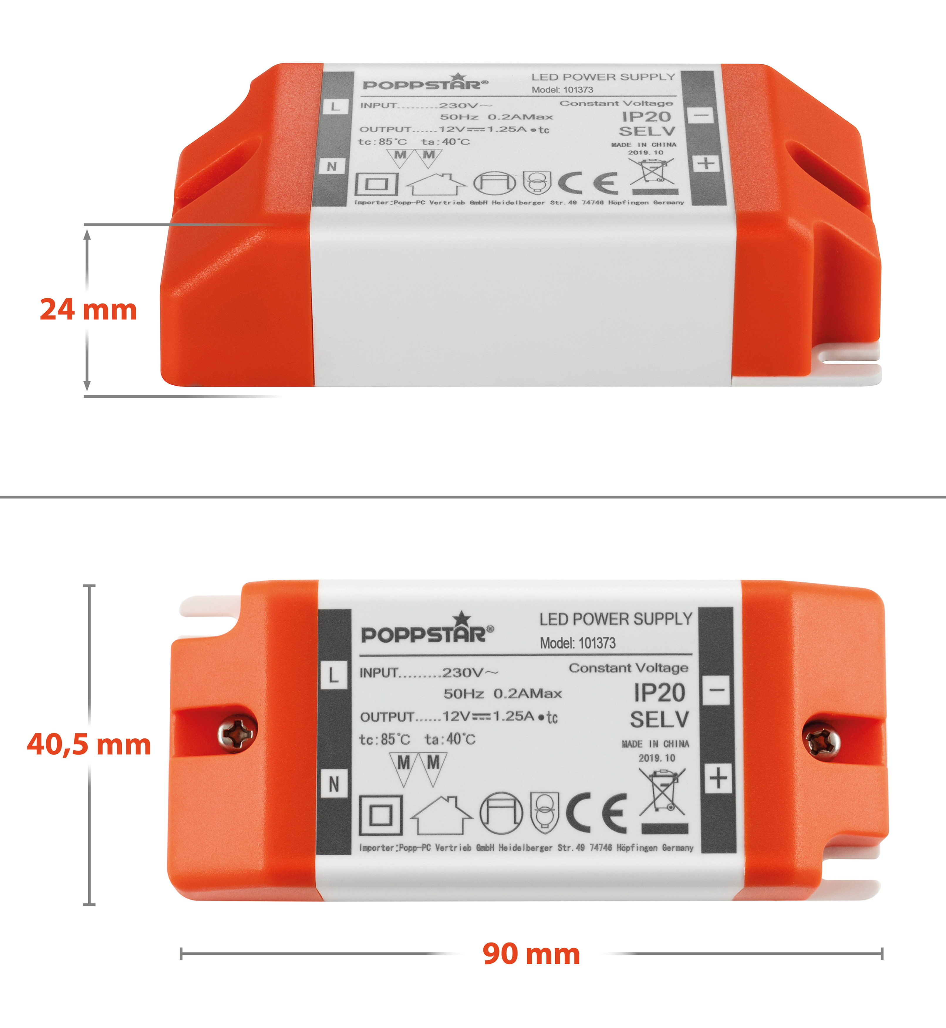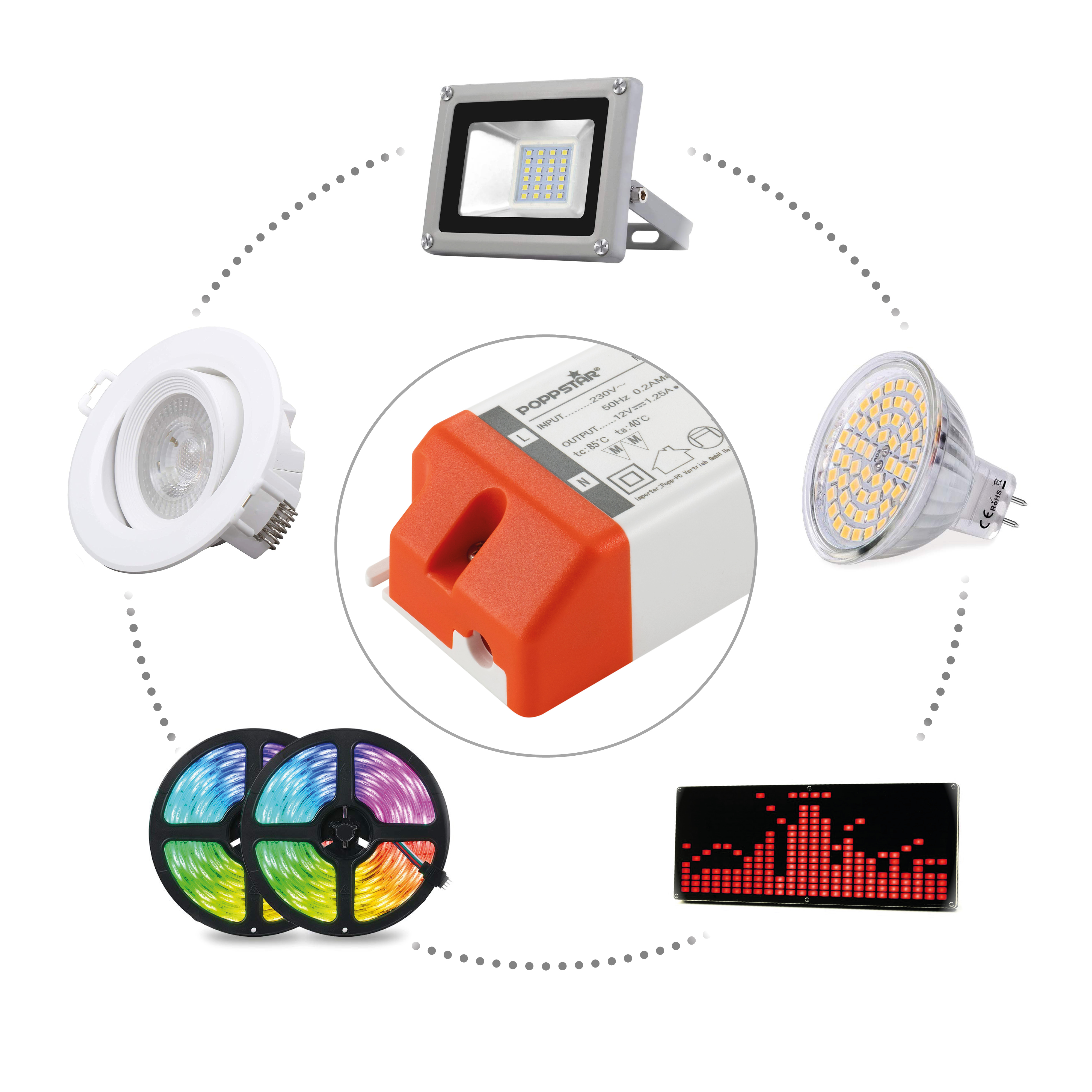 Ce transformateur Poppstar (transfo) convient, par exemple, comme ballast pour lampes LED et bandes LED (Rubans). Les résistances de ballast sont intégrées dans ces transformateurs, servent à limiter le courant, c'est pourquoi les lampes LED sont très économiques en termes de consommation d'énergie. Les transformateurs Poppstar sont peu encombrants et disponibles en différents niveaux de tension, de tailles et de performances.