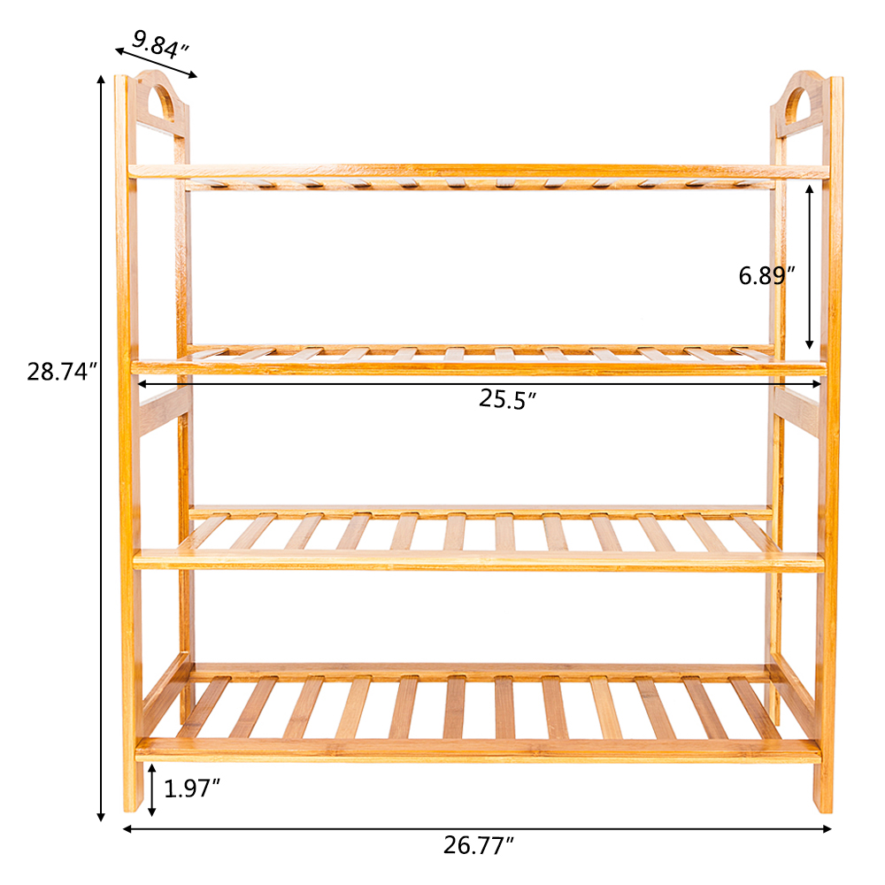 3.Multi-Use Bamboo Rack: The bamboo shelf is suitable to be placed in the hall, closets, entryway, hallway, living room, bed room, balcony, etc. And the 4 tiers bamboo rack will convenient for placing shoes, towels, sundries, books, plants, spice and small appliances in many places.