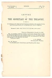 1862 Letter from the Secretary of the Treasury to the President of the Senate transmitting information relating to the costs of investigating land titles in California.