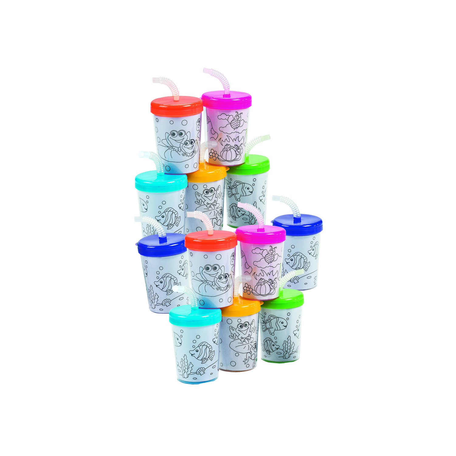 So much fun for anytime of the year! Create custom cups by coloring the included designs using your own colored pencils, crayons or markers (all sold separately on this site). These are the perfect addition to classroom crafts, birthday party activities or at-home DIY supplies for kids. A myriad of designs are included, like frogs, fish and bees, oh my! Each plastic cup includes a paper insert, straw and bright lid. Remove insert before washing. Markers sold separately online.br