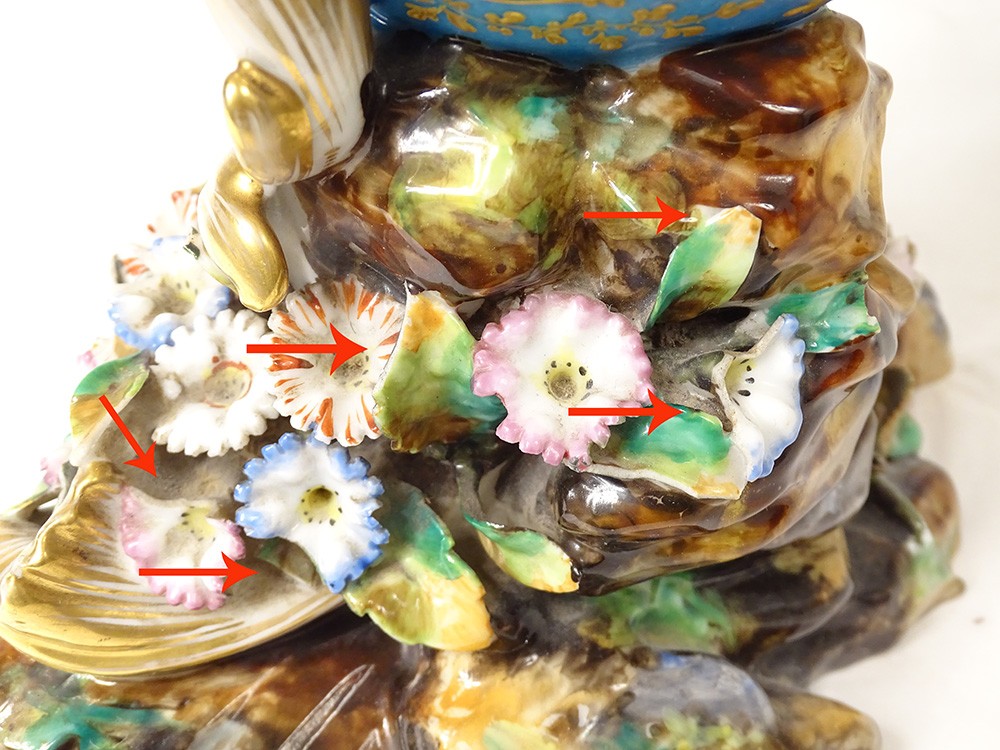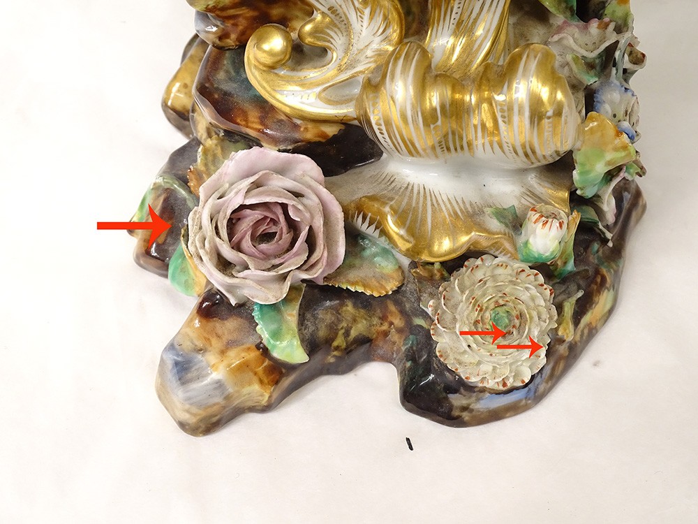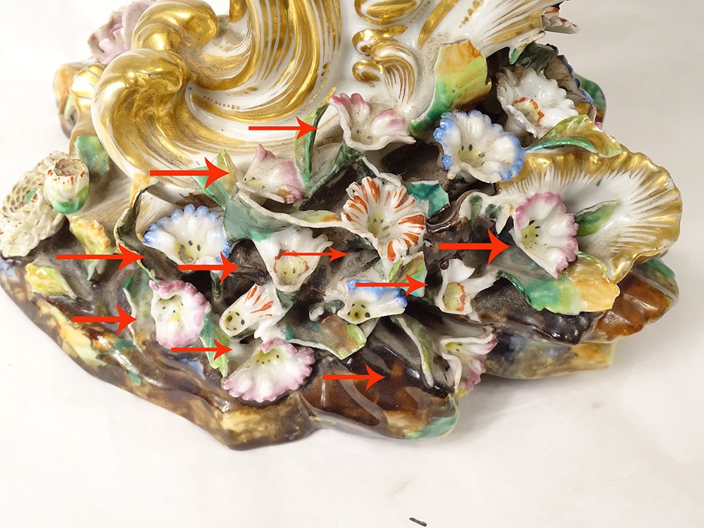 A signaler : accidents et manques sur de nombreuses fleurs, usures de la dorure et des décors par endroits, usures du temps, bien regarder les photos.