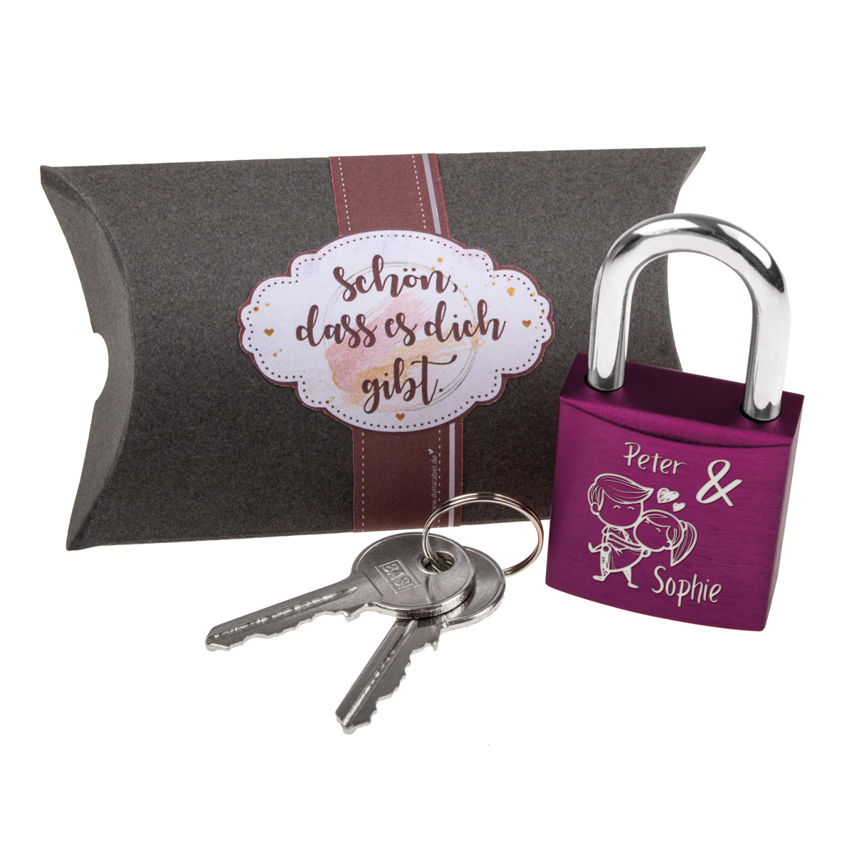 ♥ Liebesschloss ♥ lila metallic mit Geschenkschachtel inkl. persönlicher Gravur