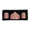 Add elegance to any wedding centerpiece design with these rose gold candle holders. Each candle holder is adorned with intricate filigree and sparkling rhinestones. To provide your wedding tables with height variation, the set includes 2 candlestick holders and a base for a pillar candle. Use them together or arrange them with other rose gold wedding decorations around your venue! Resin. (3 pcs. per unit) 2" - 3 1/2"