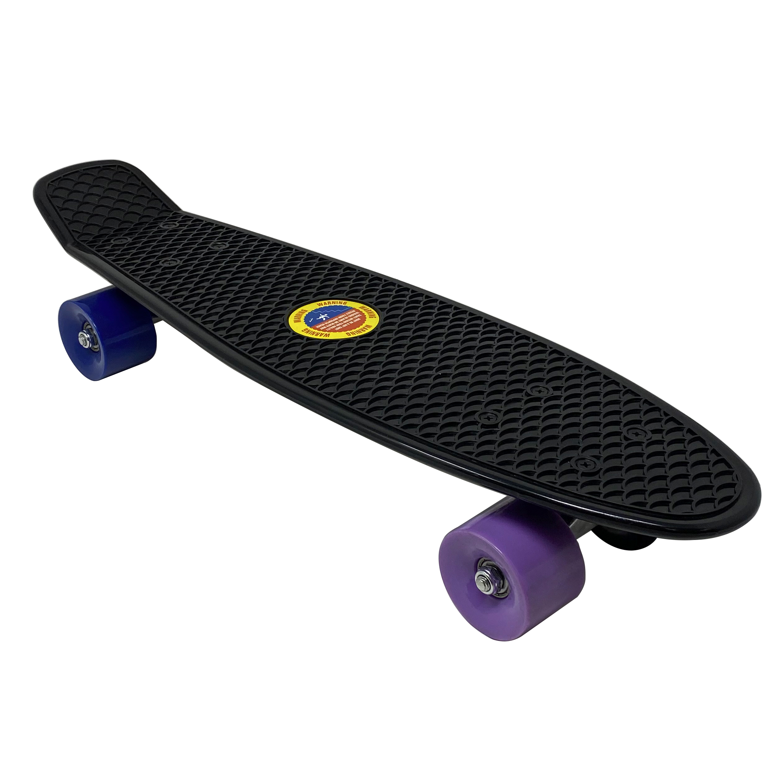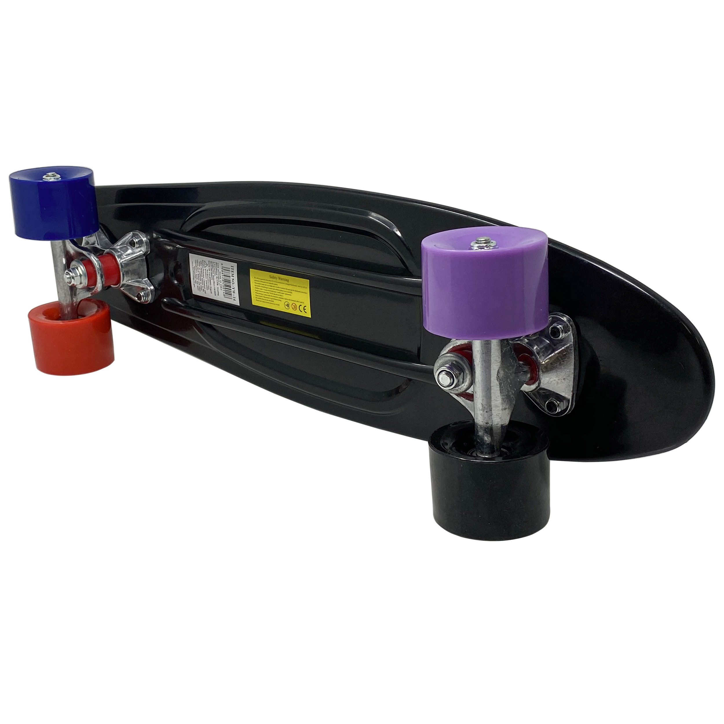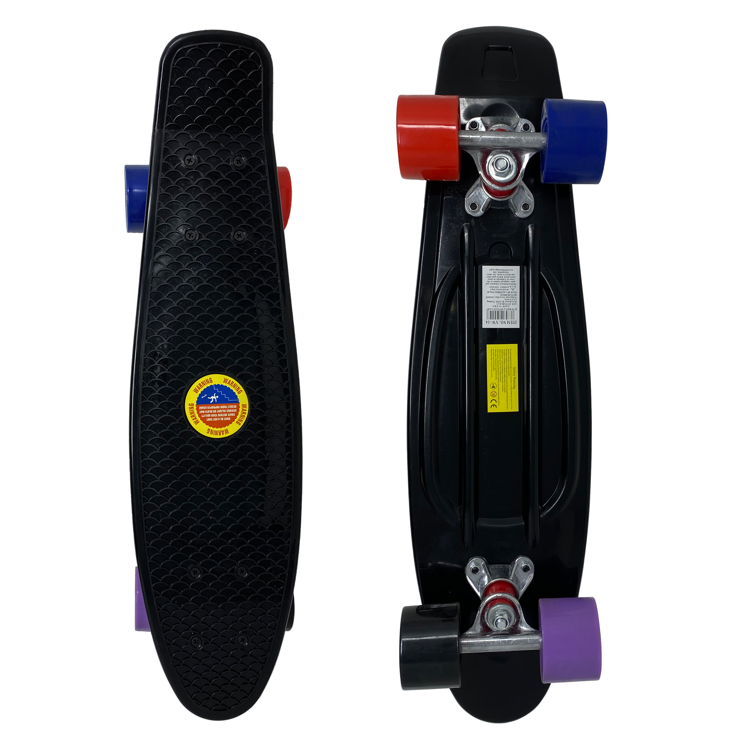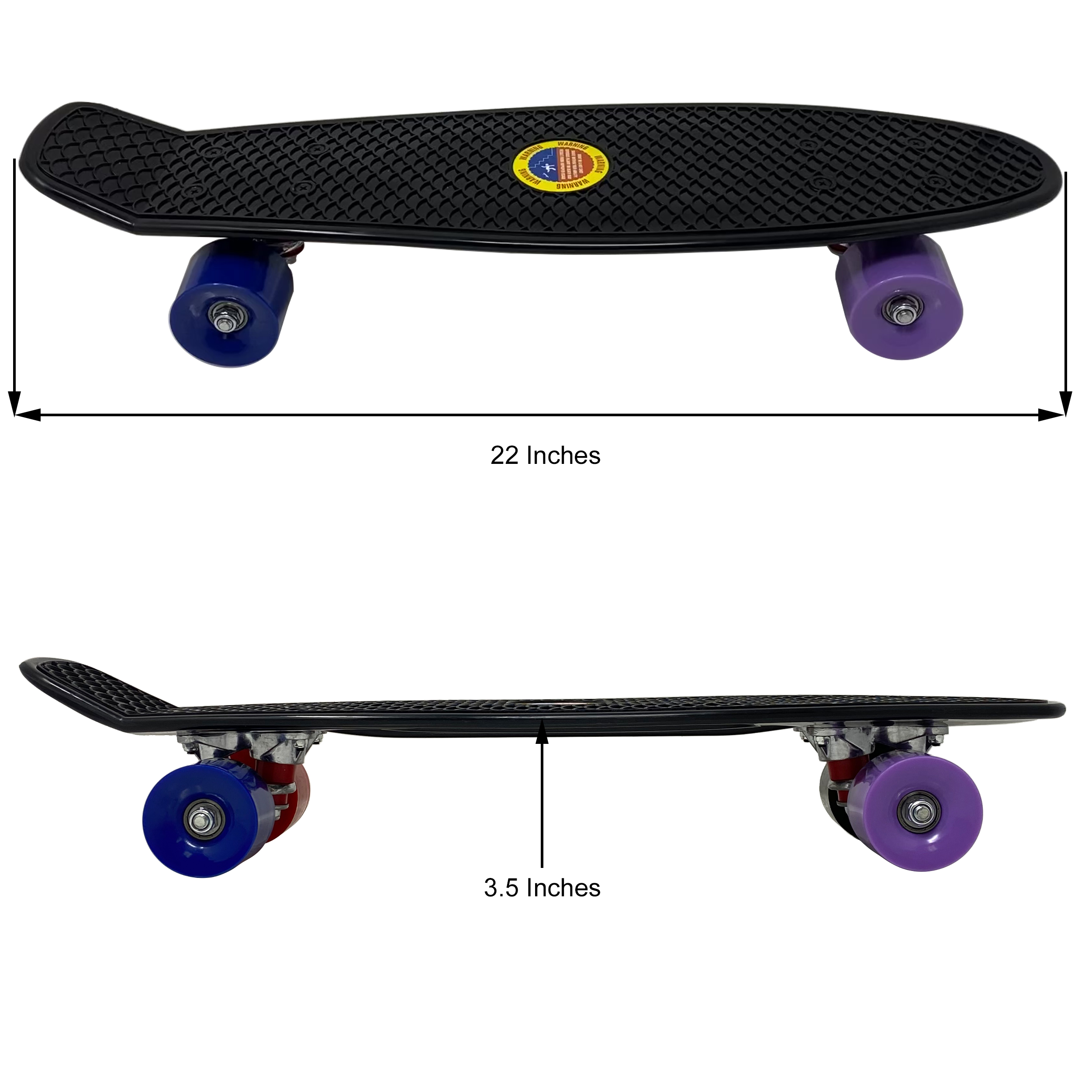 Retailery 22 Inch Skateboard With Colorful Wheels, Black. This 22-Inch skateboard is a great starter board for kids, teens, and beginners. The board features anti-slip surface which allows for a stable grip when riding which is a plus for beginners. Can be used by teens and young adults to travel to and from skate parks, schools, university campus, and pretty much anywhere you can think of. Portable allows you to ride it and store it pretty much anywhere. It's made from ABS plastic which is durable and resistant. Its equipped with four coasters that are colorful which support your skateboarding on different street surfaces for a smooth ride as you glide! Measures: 22 inches long by 5.75 inches width by 3 inches high. Not Suitable for Children under 6 Years. PROPOSITION 65 WARNING: This product contains DEHP, a Phthalate chemical and other chemicals known to the State of California to cause cancer and/or birth Defects or other reproductive harm. For more information, go to: www.p65warnings.ca.gov/bpa.