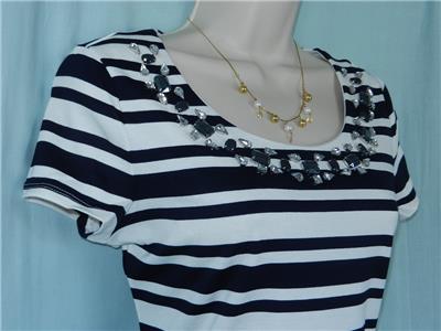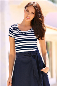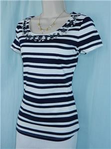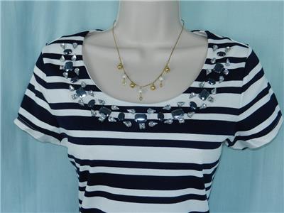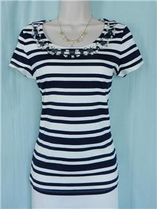 Description : Sailor stripes get glamorous with regal blue beads at the neckline. This eye-catching jeweled knit top will elevate your wardrobe essentials. Very soft, stretchy and comfortable fabric.