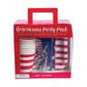 This patriotic party kit features enough red white and blue party supplies for eight people. From disposable tableware to party decorations and party favors this party assortment has the basics covered! Find more products to bolster your patriotic party throughout our site! (33 pcs. per unit) Includes: 8 Paper Dinner Plates (9") 8 Paper Cups (3 3/4" 9 oz) 8 Paper Luncheon Napkins (6 1/2") 8 Plastic Noise Makers (3") 1 Pennant Banner (60")