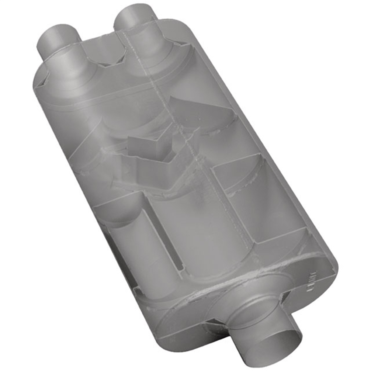 50 Series Heavy Duty Muffler; 3.0 in. Center Inlet/2.5 Dual Outlet; Case Dimensions 5 in. x 10 in. x 18 in.; 24 in. Overall Length; Aluminized Steel;