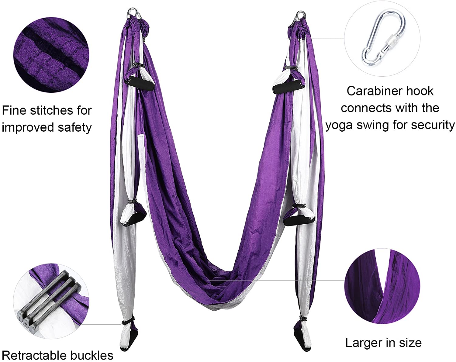 With the help of our INP aerial yoga swing, you can do full-body exercise anytime anywhere. Made of polyester taffeta, the swing is durable, colorfast and smooth. You can practice backbends, splits, inversions and more, which will also deepen your body awareness and balance, and relieve your back and joint pain. Doing the splits stretches the hamstrings and opens your hip flexors. This swing also can be used as a spinal traction device. By hanging freely upside down from your hips, you reverse gravity compression and allow your spine to lengthen and release.